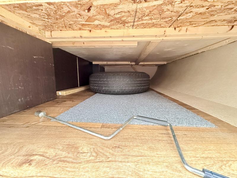 In the front of the trailer you will find a queen bed, two wardrobes, and a shelf.