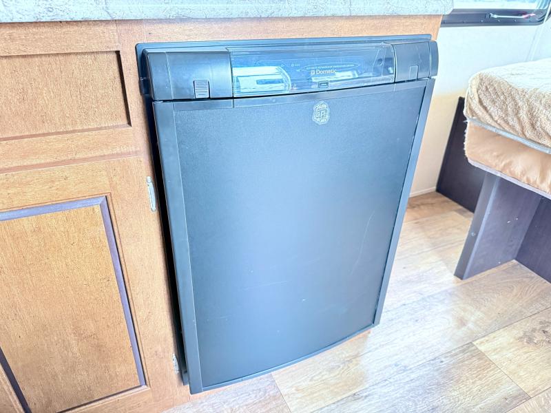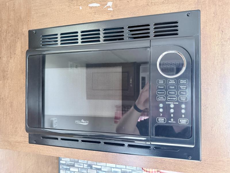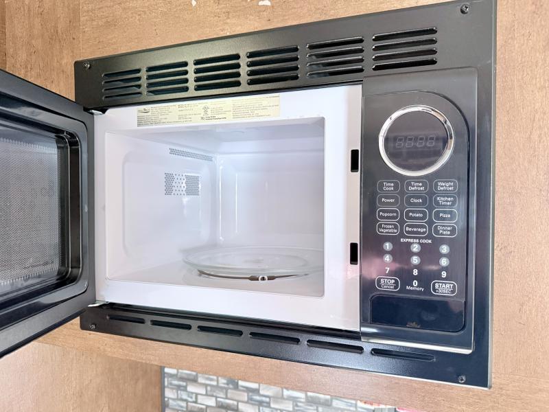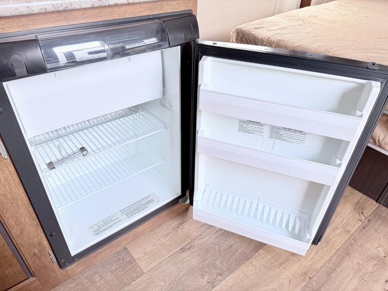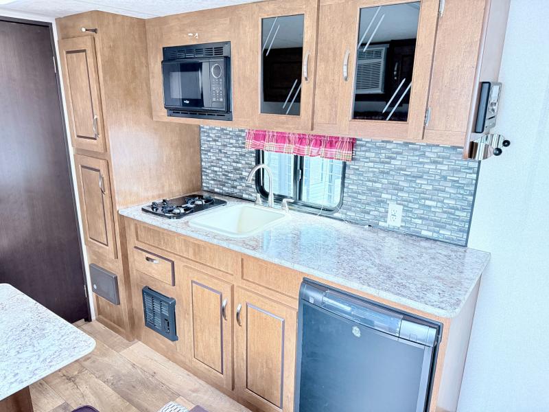 Along the road side of the trailer is where you will find the kitchen area. Here there is extra counter space, a refrigerator below the counter, an overhead cabinet, a sink, a microwave, a two burner range, and a pantry.