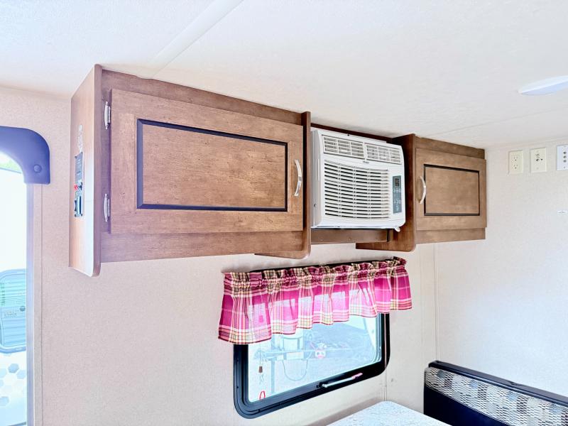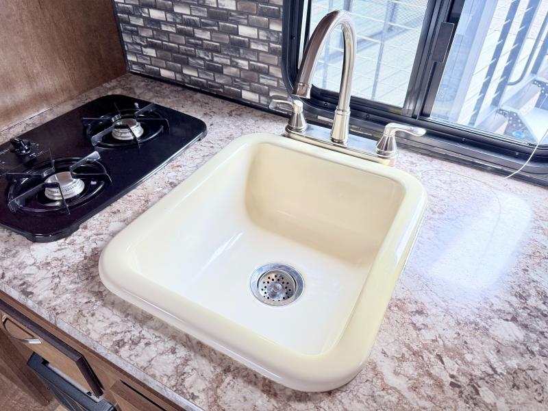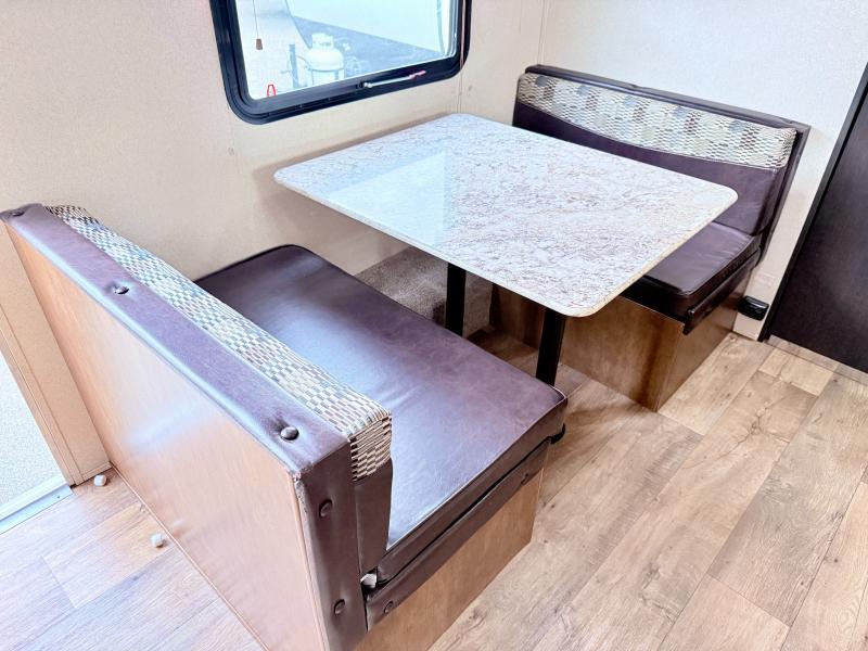 As you enter this travel trailer, to the left there is a dinette, overhead cabinet, and a TV hook-up. Enjoy your meals around the dinette while planning your next day of adventure, and if you need additional sleeping space, then you can easily convert the dinette into a bed.