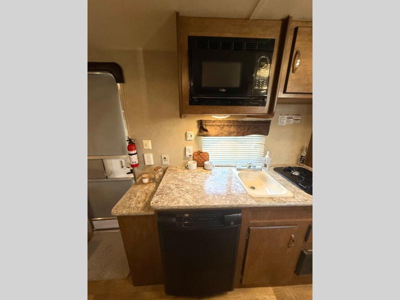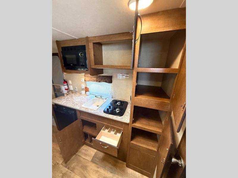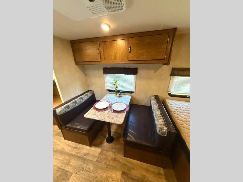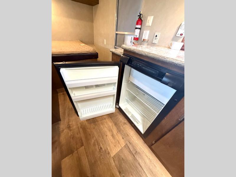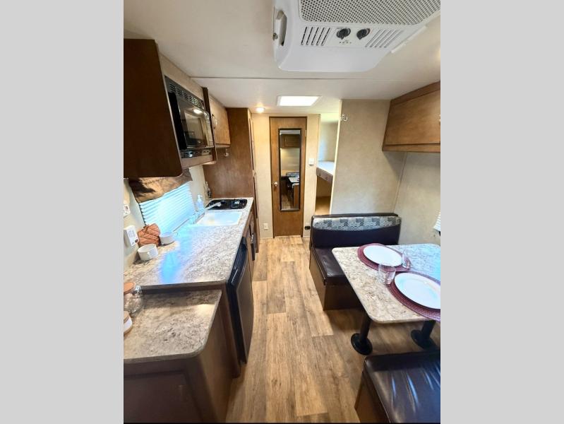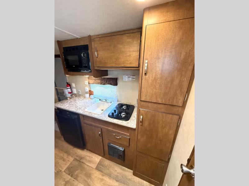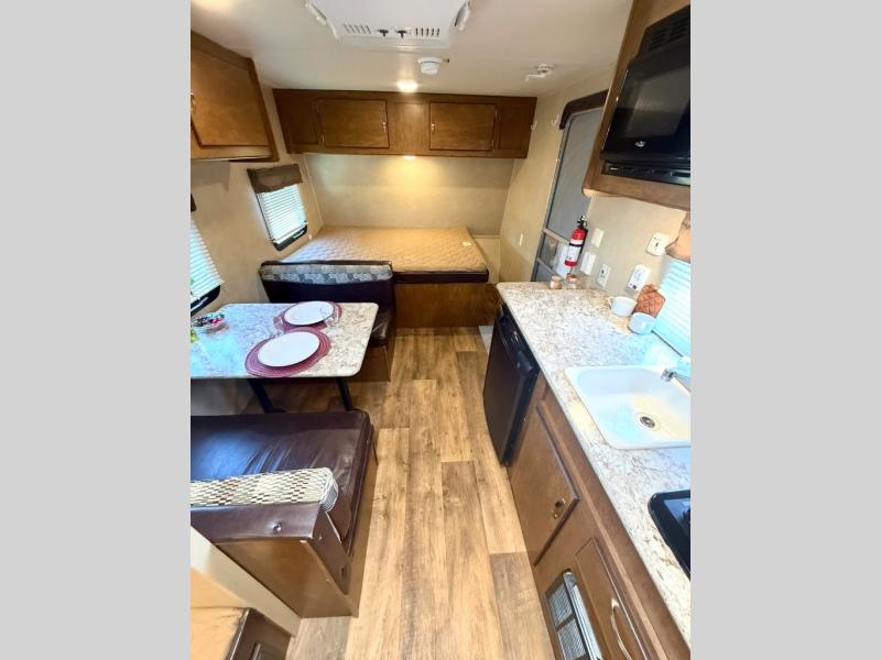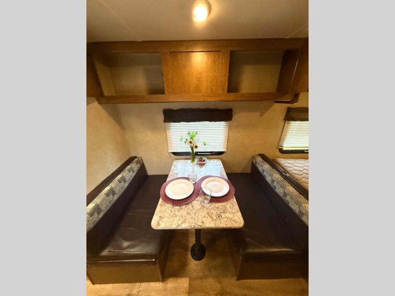 The main living area of the trailer offers a wardrobe, microwave, refrigerator, sink, two burner range, and pantry on one side of the trailer. The opposite side has a dinette.