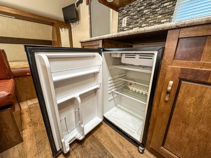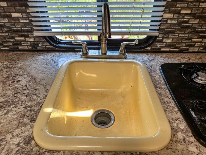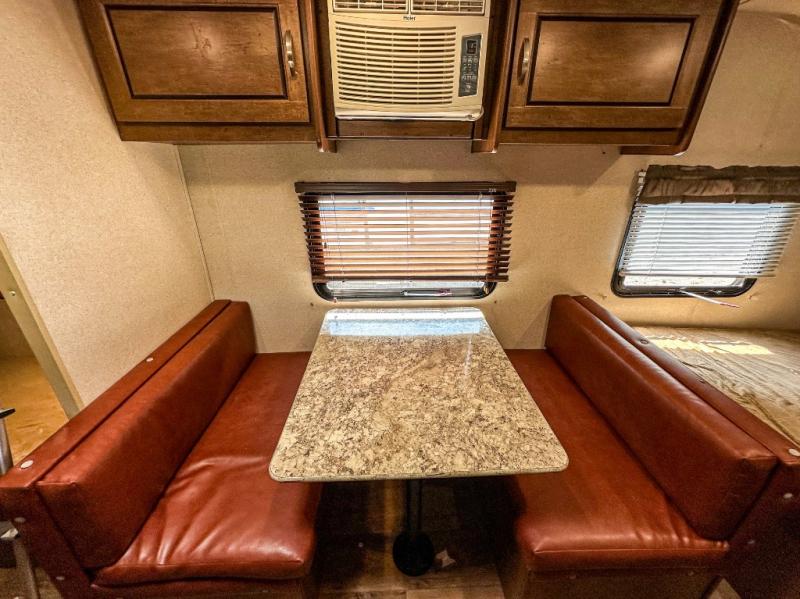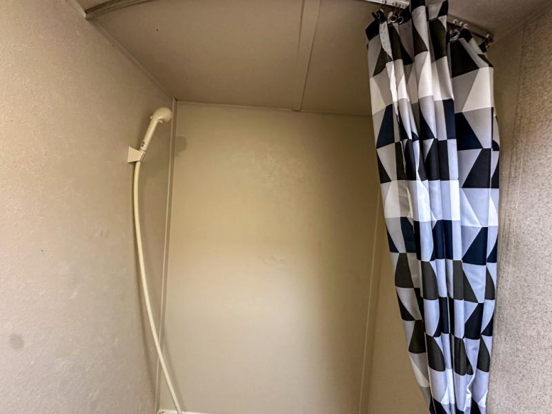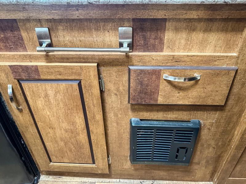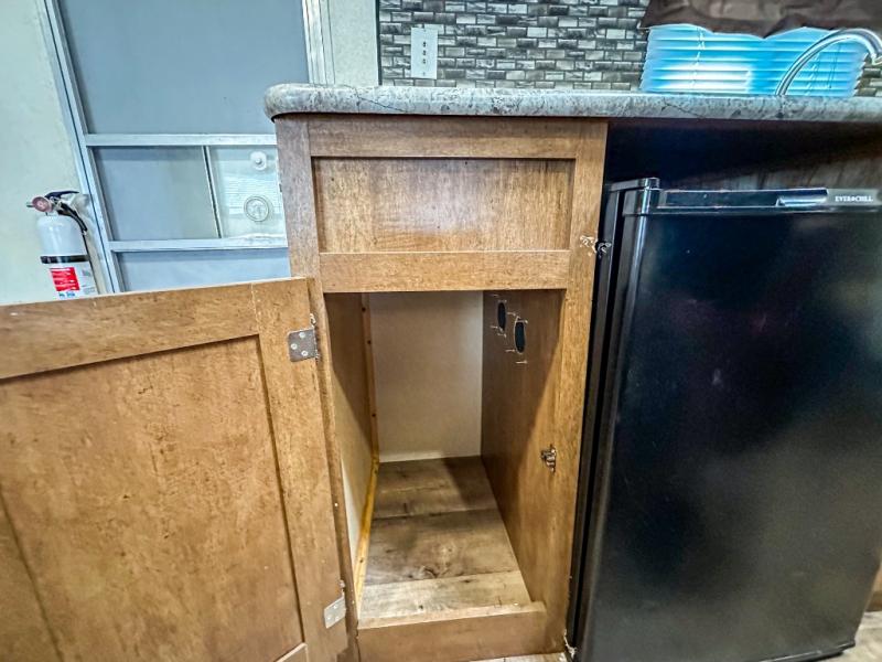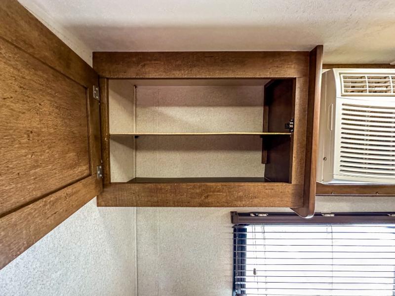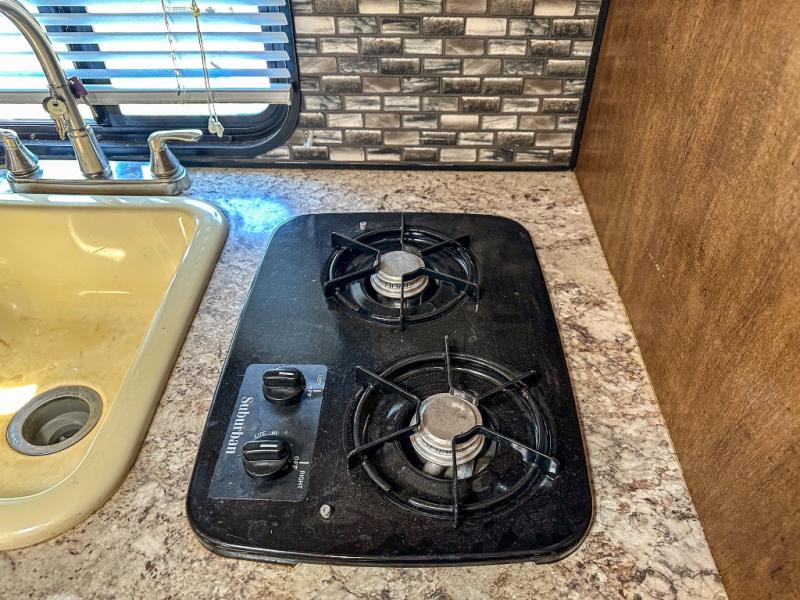 The kitchen area offers an under counter refrigerator, extra counter space, a sink, two burner range, and a pantry. Across from the entry door there is a dinette which can easily convert into additional sleeping space at night.