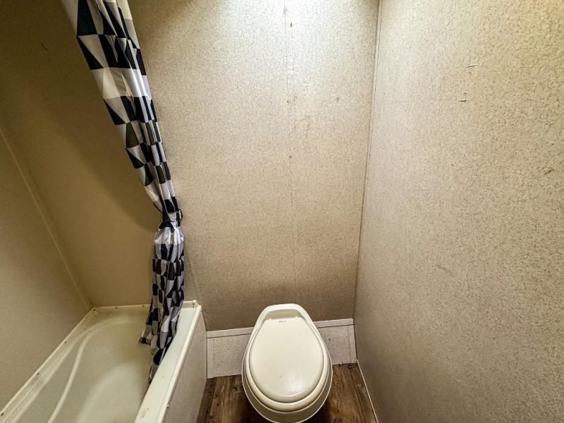 The bathroom is across from the bunks beds and features a toilet and a tub.