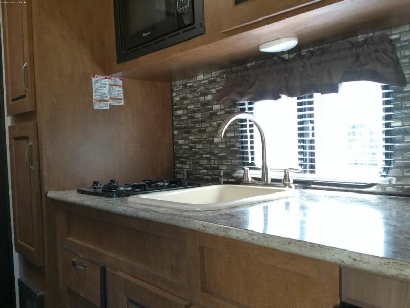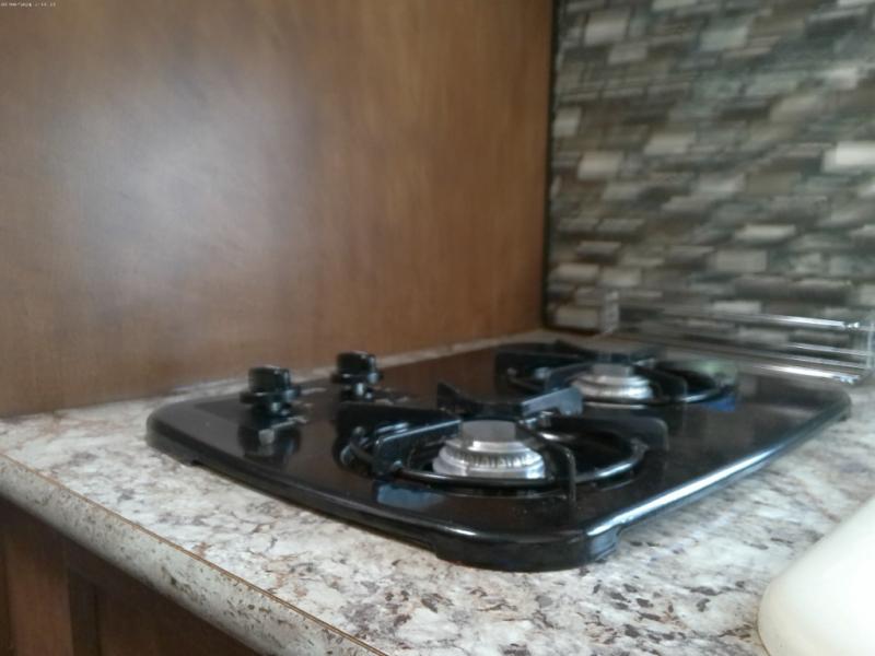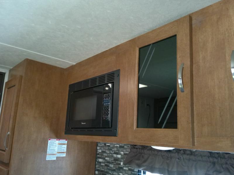 Along the road side of the trailer is where you will find the kitchen area. Here there is extra counter space with a refrigerator below, an overhead cabinet, a single sink for cleaning up, and a two burner cook-top with overhead microwave oven. There is also a pantry next to the cook-top for all of your dry and canned good storage needs.