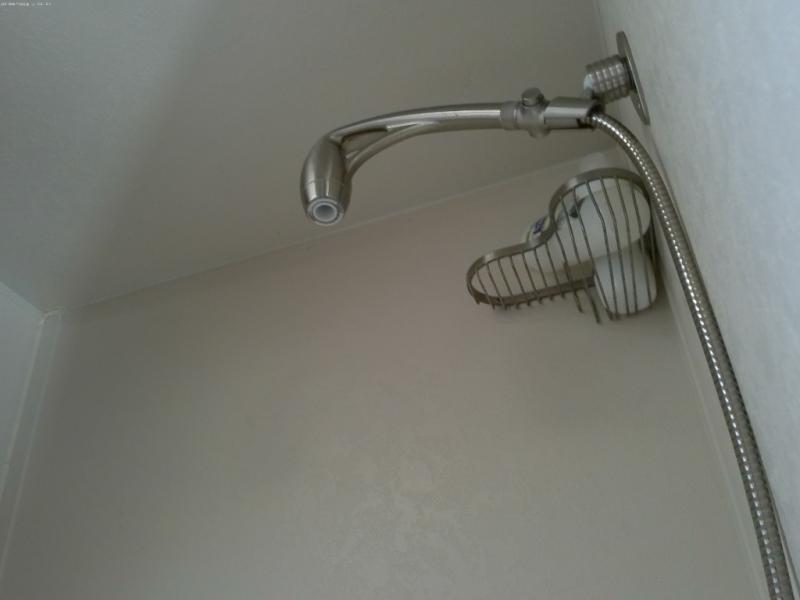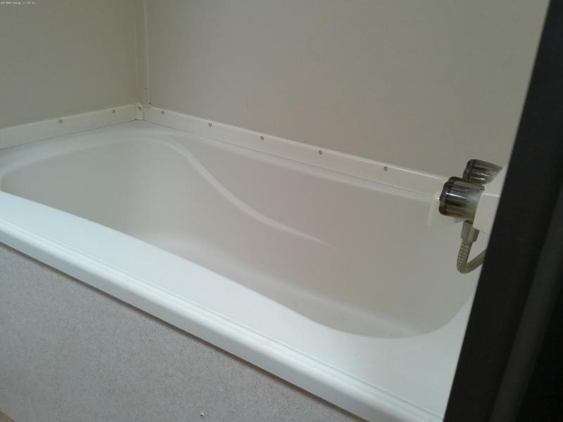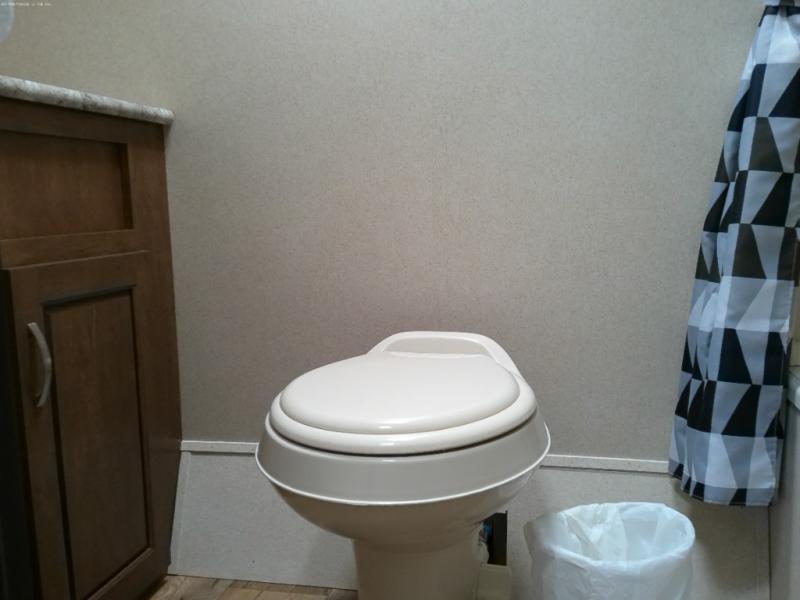 The bathroom is located in the rear of the trailer. Here you will find a toilet, a shower, and a sink with a medicine cabinet above.