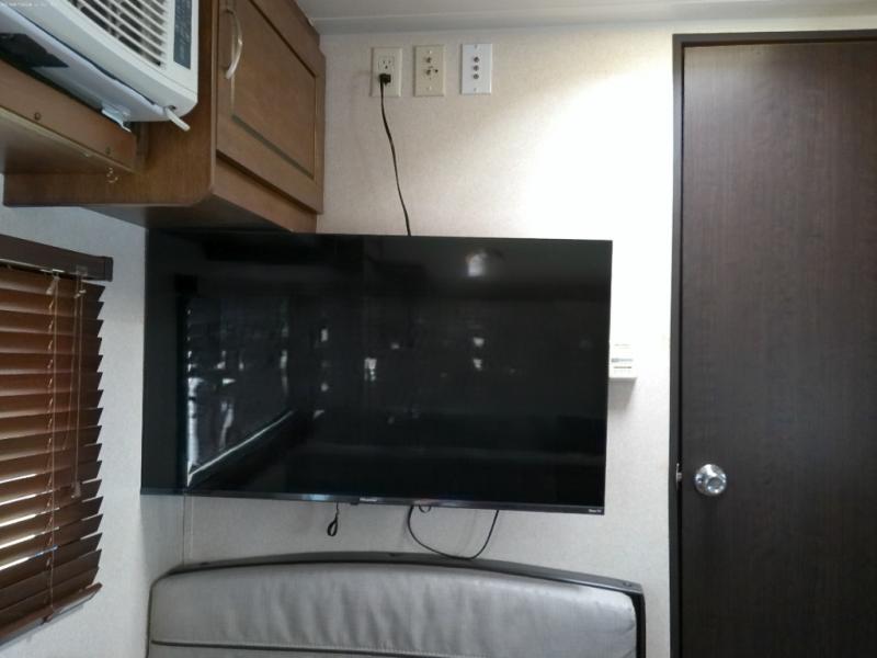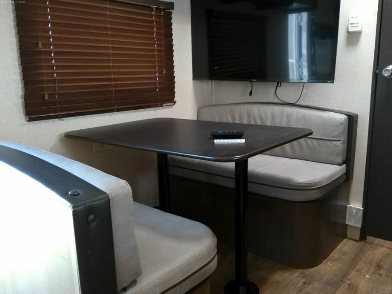 To the left of the entry door you will find a dinette, overhead cabinetry, and a TV hook-up. Enjoy your meals around the dinette while planning your next day of adventure, and if you need additional sleeping space, you can easily convert the dinette into a bed at night.