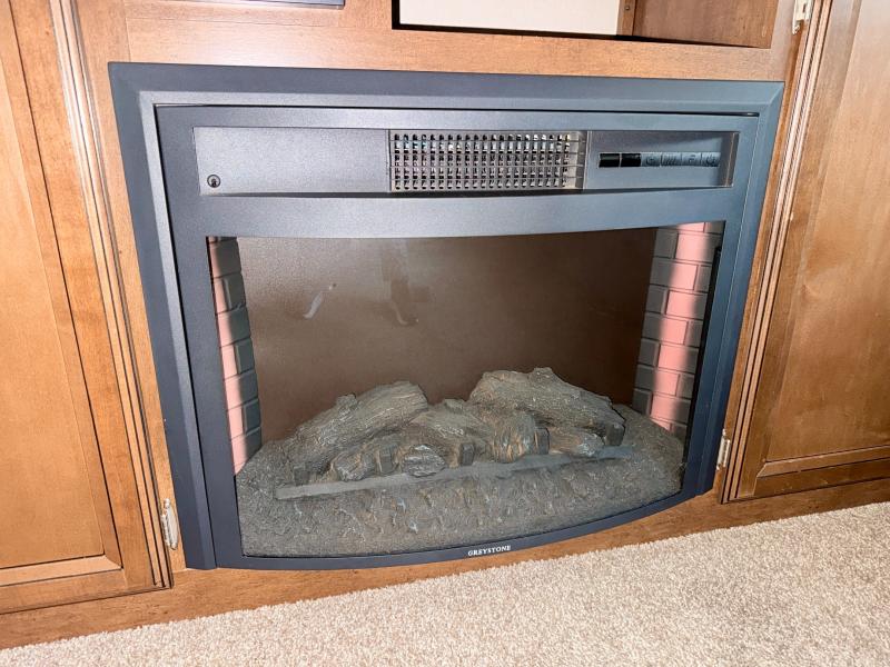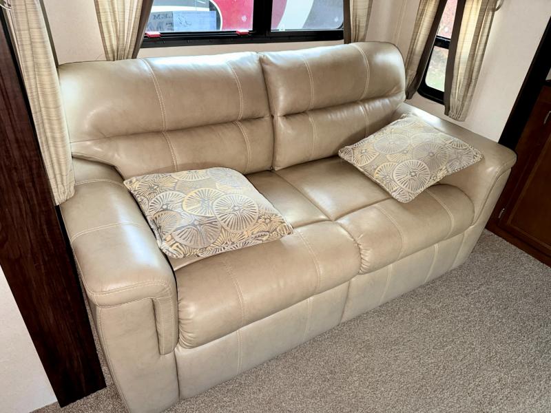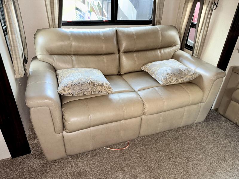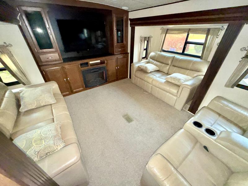 Next, head towards the rear to a raised inviting living space with dual opposing slides also. Here there are tri-fold sofas in each slide that face one another. Each can easily be made into a bed for overnight guests. There is also theater seating for two, and a full rear wall entertainment center with overhead cabinets, and a fireplace to enjoy. Beneath this area you will find two large pass-through storage bays for all of your outdoor camping gear, and more.
