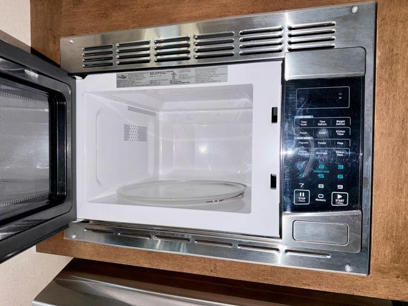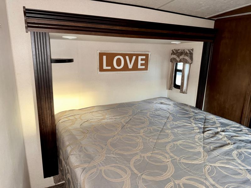 The door at the head of the hall in front leads into a master bedroom where you will enjoy sleeping away from the hustle and bustle of the living area. Sleep comfortably on a custom king size bed slide out that includes a nightstand and shelf nearby for your things. Opposite a dresser for your clothing, and a front wall wardrobe with shelf, plus it has been prepped for an optional washer and dryer if you choose to add the appliances.