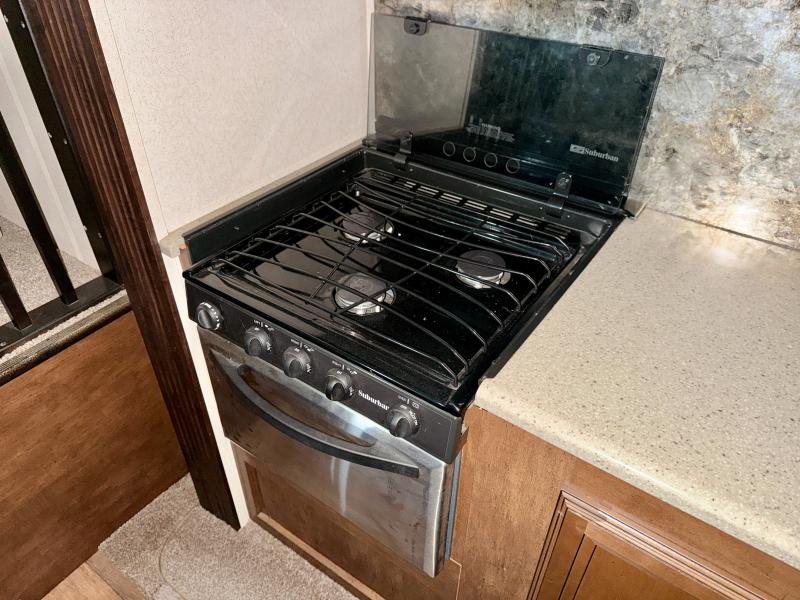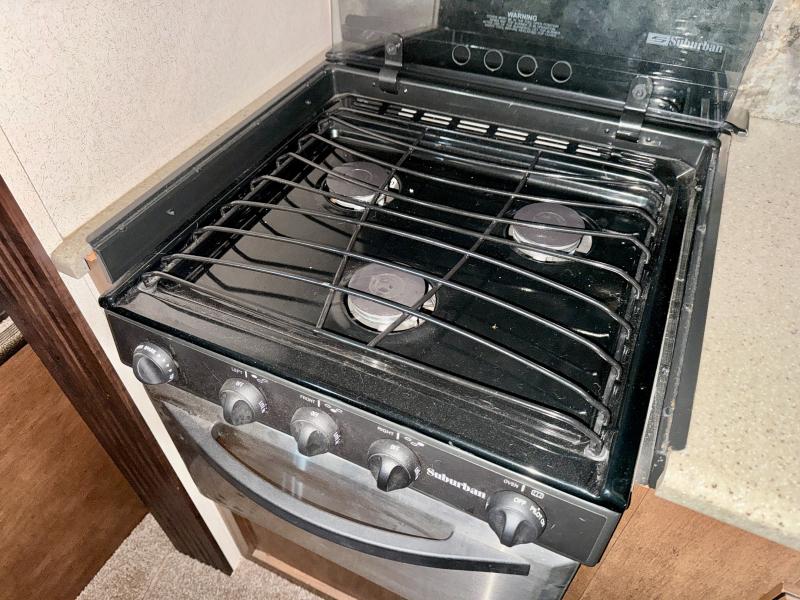 Enter the spacious kitchen where you will find double slides including a slide out free standing dining table with four chairs, and opposite a slide out refrigerator, pantry, and counter area with a three burner range with microwave above at the end. There is a hutch with overhead storage along the interior wall straight in the door, and a kitchen island with a sink.