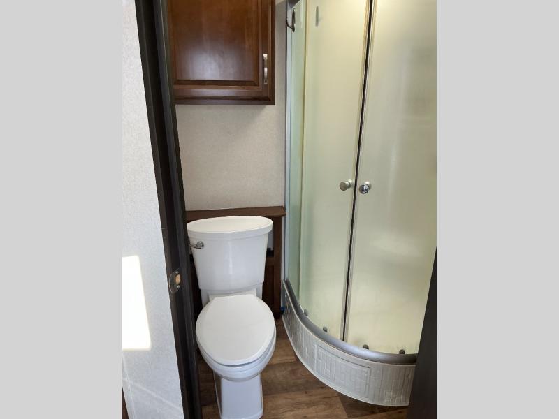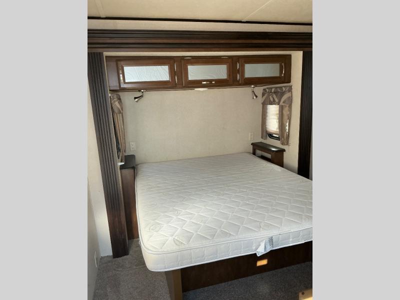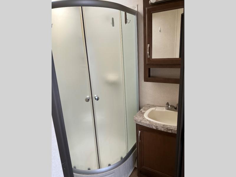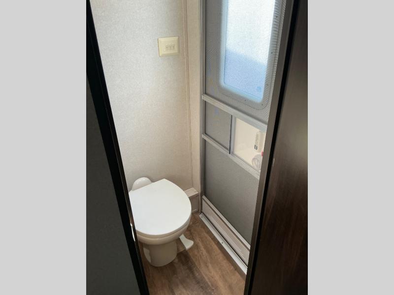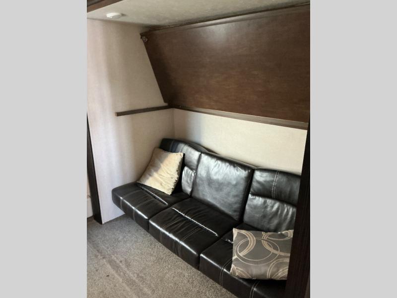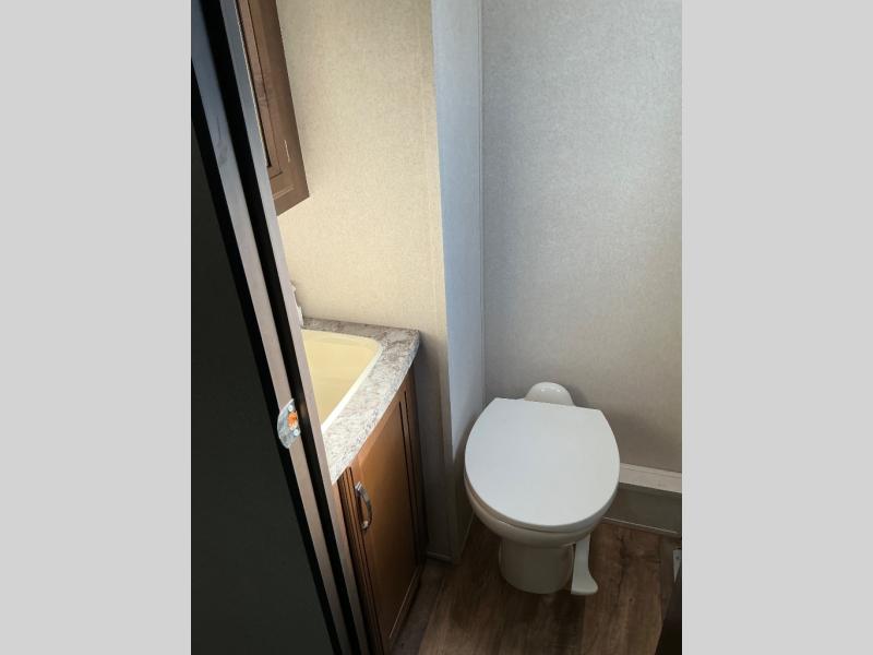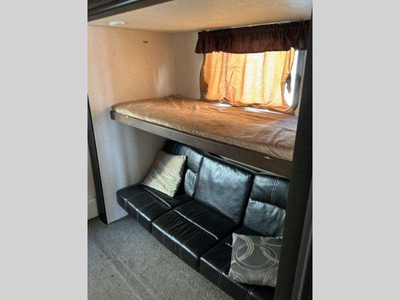 In the rear of the trailer your kids can enjoy their own space with the bunkhouse. There are two opposing slides, one slide out has a set of bunks or you can choose an optional jiffy sofa in place of the lower bunk. On the opposite side of the room the slide has an upper bunk with a wardrobe and entertainment center below the bunk. Off of the bunk room there is a convenient half bath with a door leading outside from the bathroom.