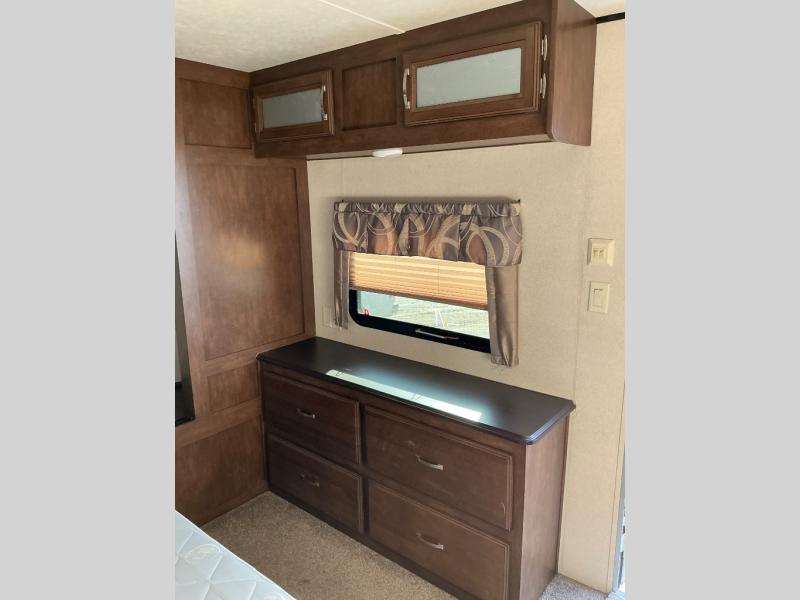 In the front bedroom you will find a queen bed slide with nightstands. Along the front wall there is a large wardrobe with shelves. Across from the bed you will find a nice size dresser with overhead cabinets. There is also a private entrance/exit leading outside from the bedroom.