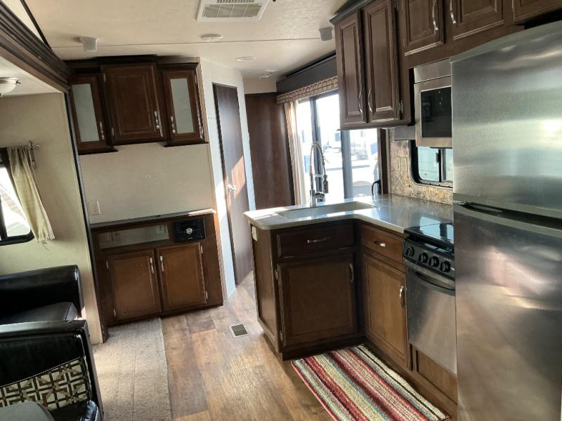As you enter through the patio door, to the left there is a L-shaped countertop with a double kitchen sink, three burner range, microwave, and a house type refrigerator. The opposite side of the trailer has a slide with a u-shaped dinette and a sofa. Next to the sofa you will find an entertainment center.