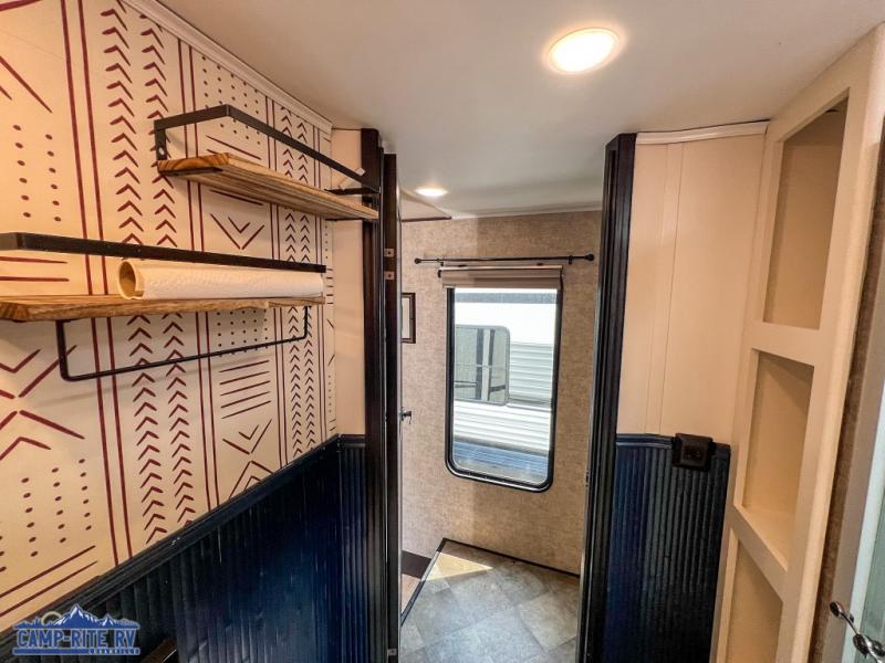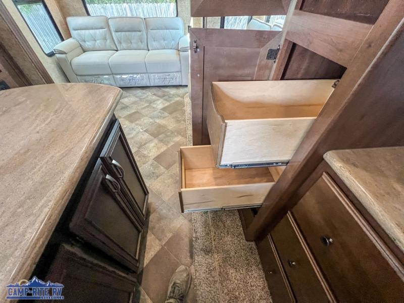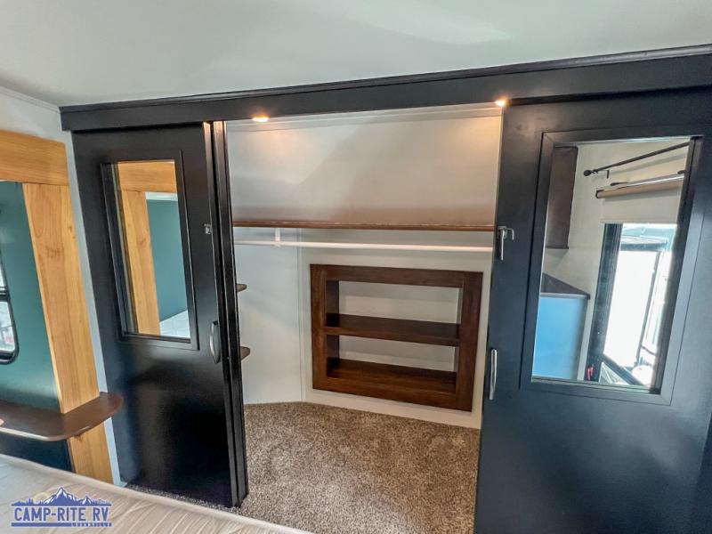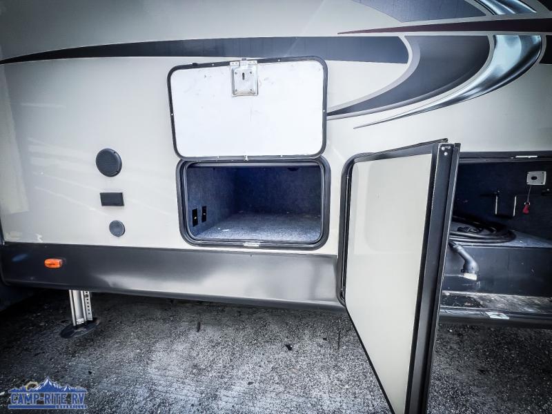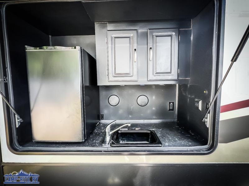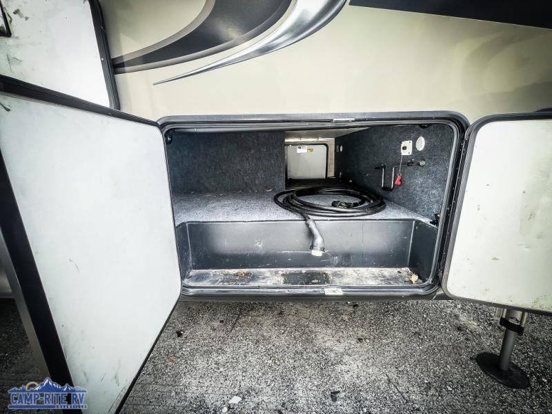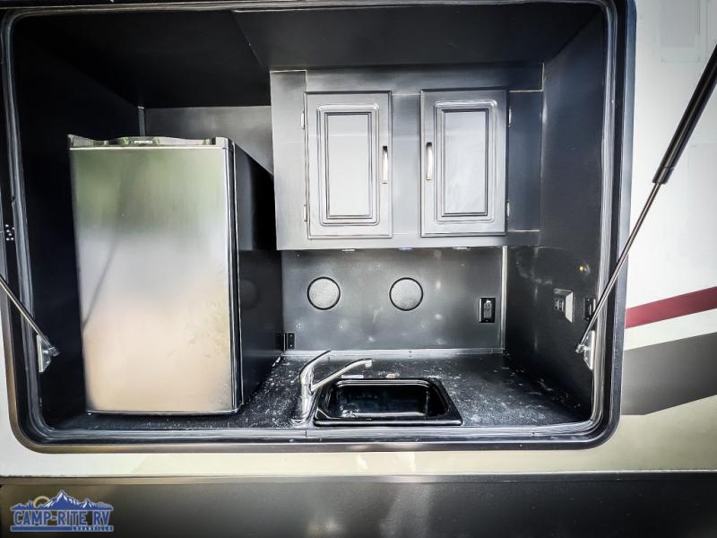 There are plenty of overhead cabinets throughout the fifth wheel, as well as a large pass thru storage compartment outside. You will enjoy the exterior kitchen as well as a bumper mount swivel gas grill, and more!