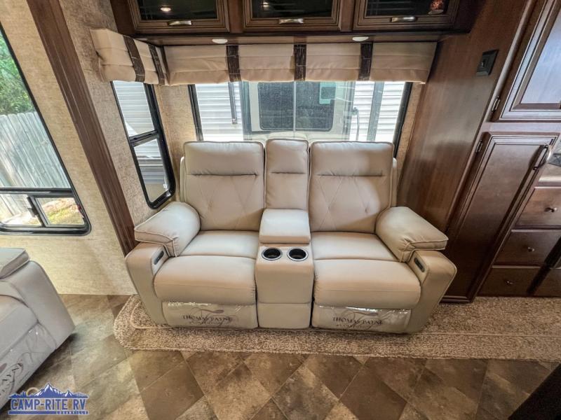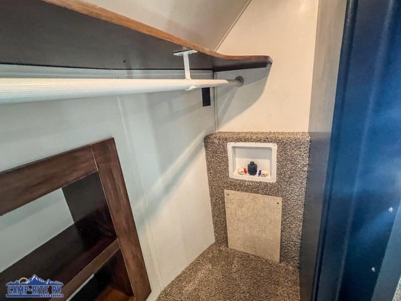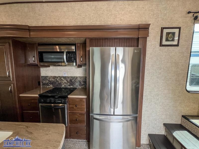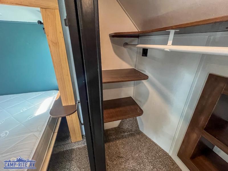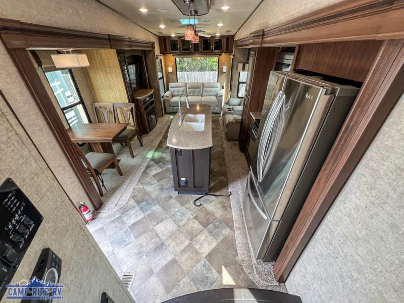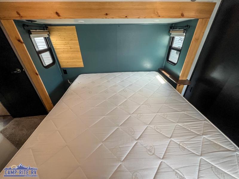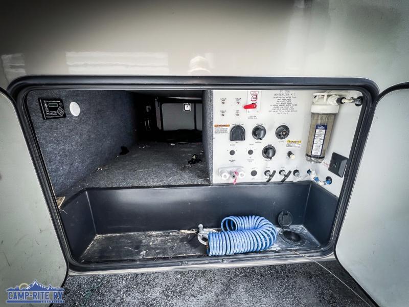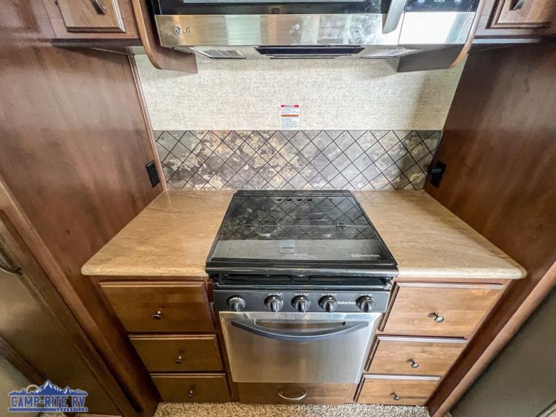 There are plenty of overhead cabinets throughout the fifth wheel, as well as a large pass thru storage compartment outside. You will enjoy the exterior kitchen as well as a bumper mount swivel gas grill, and more!