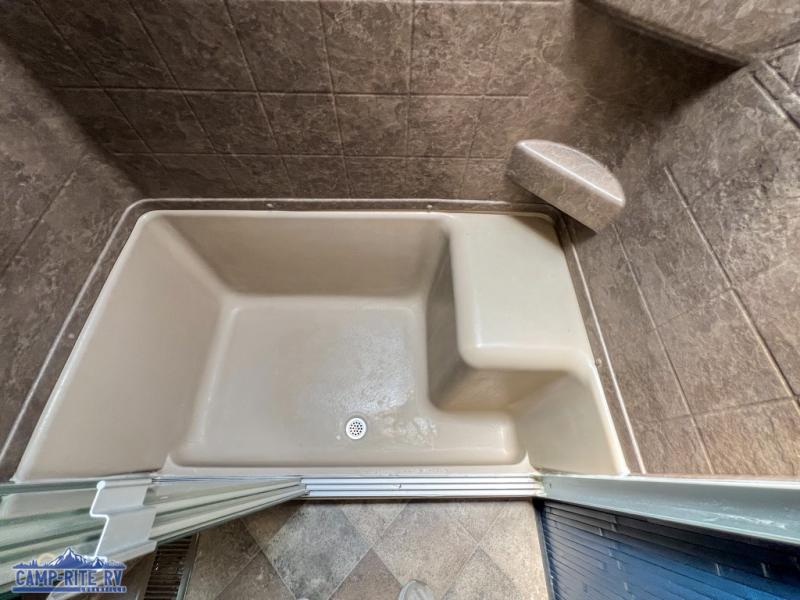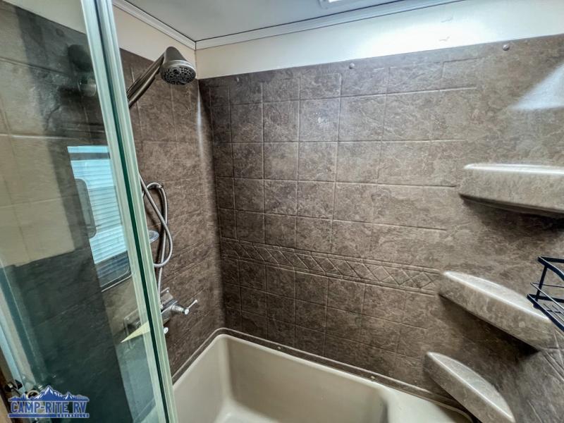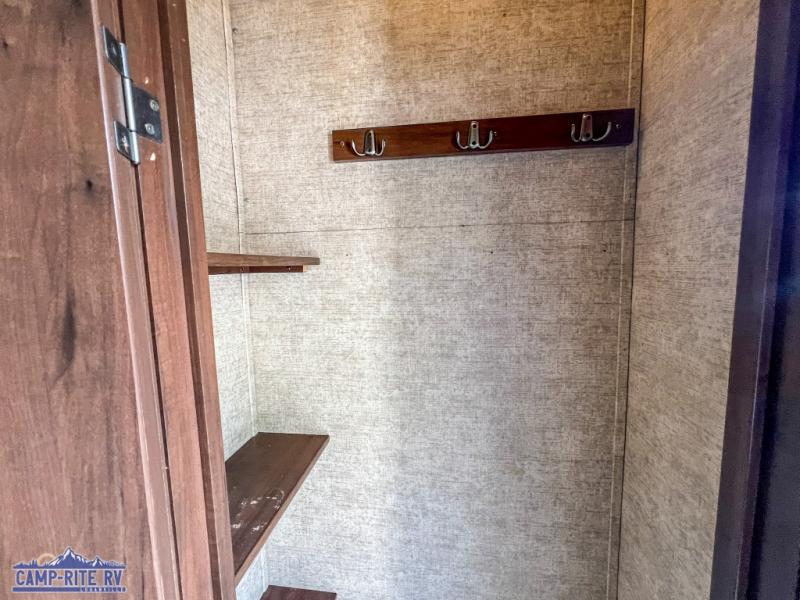 Step inside to your right to find a handy walk-in closet with shelves. To the left you will see the first slide with a free standing dinette, and an entertainment center with cabinets, a counter, and a fireplace below. Along the rear wall, you will find a tri-fold hide-a-bed sofa with end stands and overhead storage. The opposite slide offers two recliners, a pantry, three burner range, microwave, and a refrigerator. The kitchen island provides a double sink, lots of counter space, and a pendant light box above.