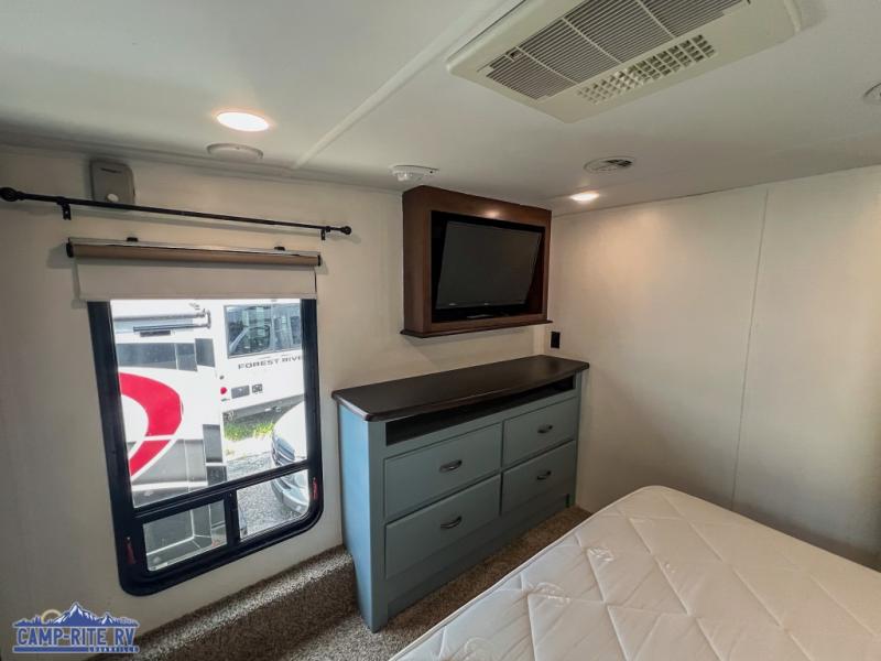 The front bedroom features a queen bed with a nightstand inside a slide out along the road side wall, a large front wall wardrobe including shelves which is also washer and dryer prepped, plus a dresser and TV hook-up.