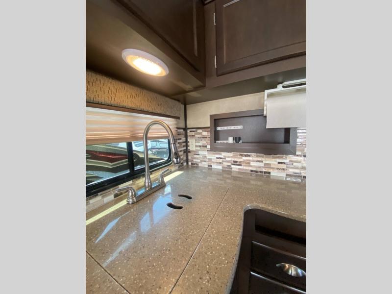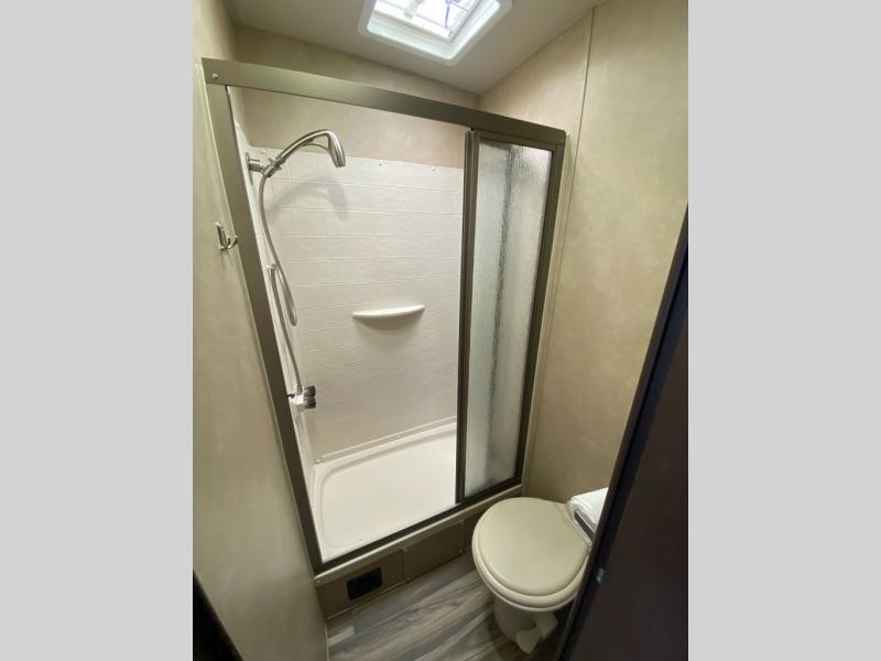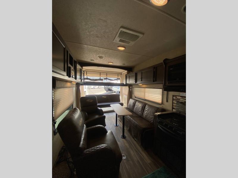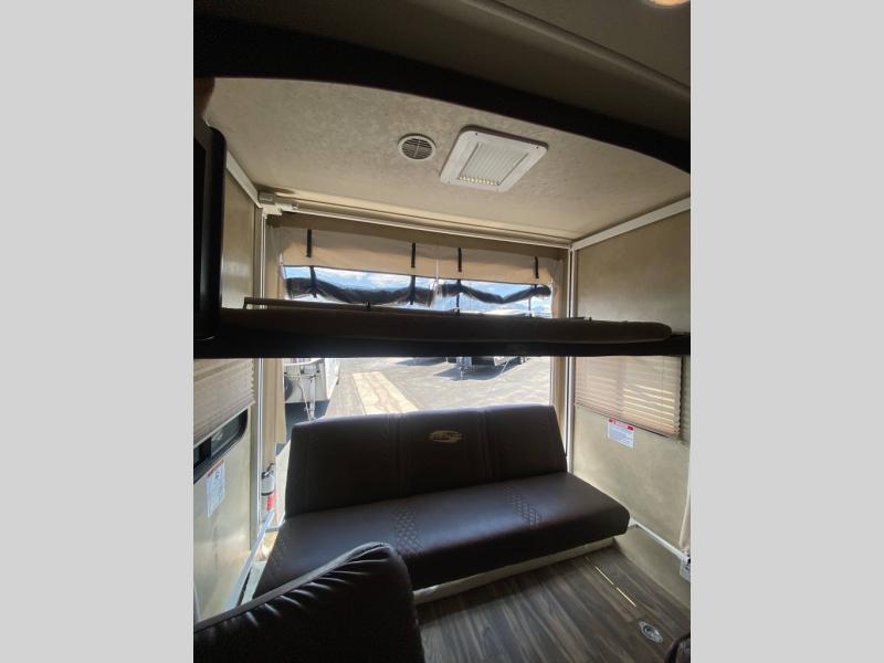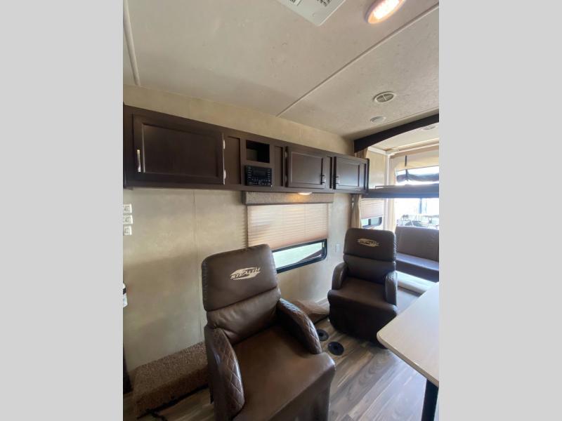 Moving forward there are two captains chairs with an overhead cabinet between them on one side and a sofa with overhead cabinet and table on the other side. You may choose an optional sofa slide out to provide more interior space.