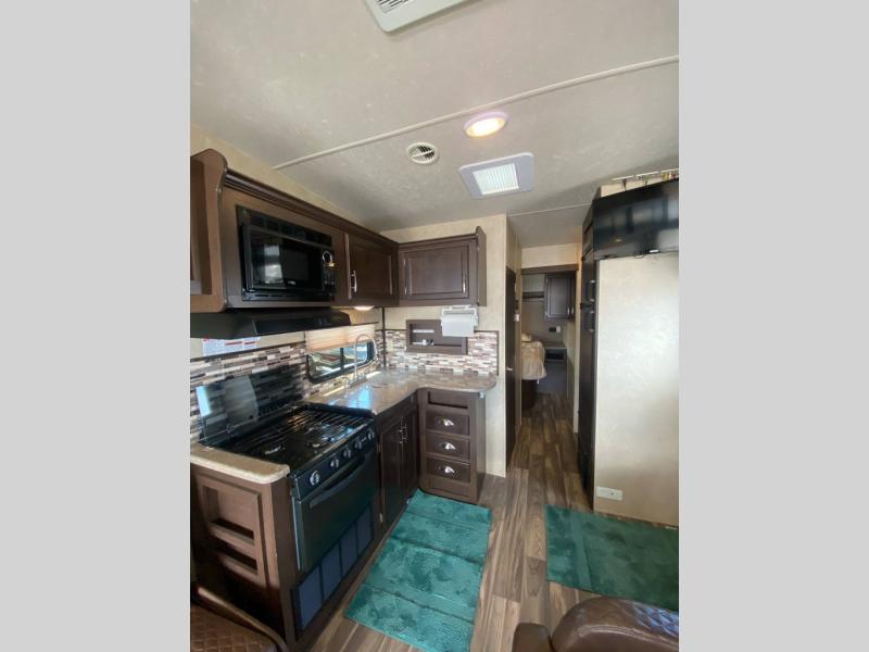 A pantry and a refrigerator are near the entry door with the rest of the kitchen across the toy hauler. It includes corner counters with corner overhead cabinets, a double kitchen sink, three burner cook top and overhead microwave.