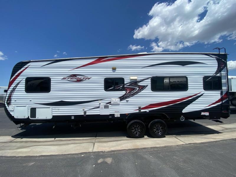 Forest River offers the Stealth AK2612 toy hauler travel trailer with a front bedroom and outside kitchen.
