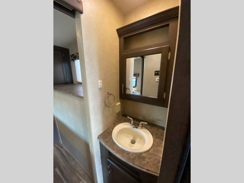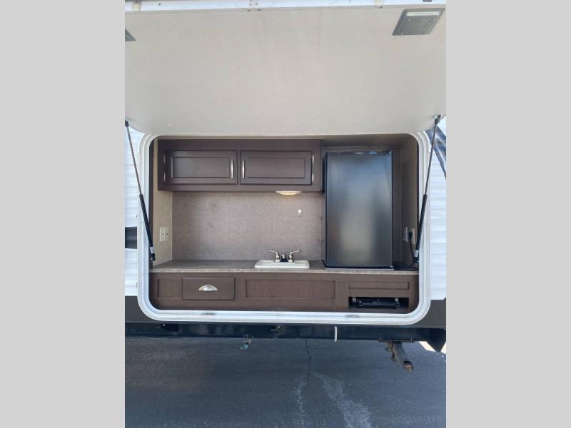 Outside the Stealth AK2612 you will find Onan generator prep, an awning and an outside kitchen. The kitchen includes a sink, counters, overhead cabinets and a refrigerator, plus so much more!