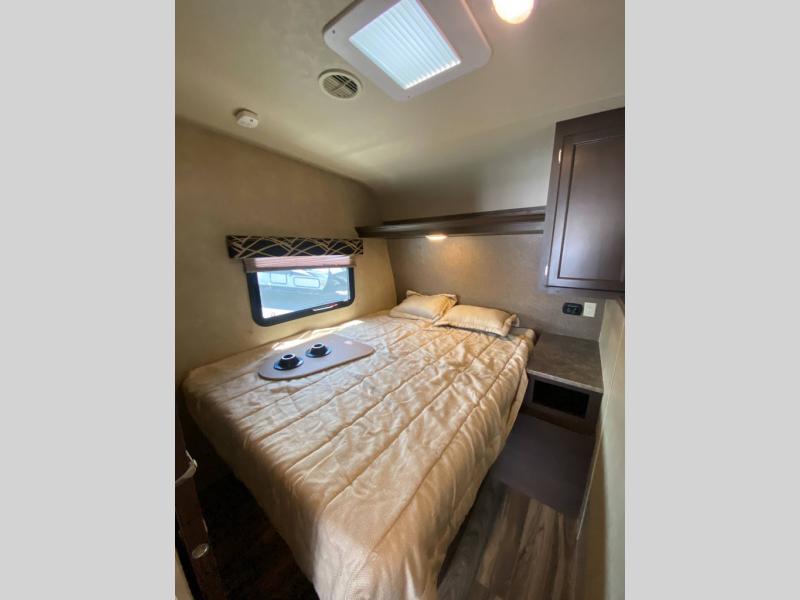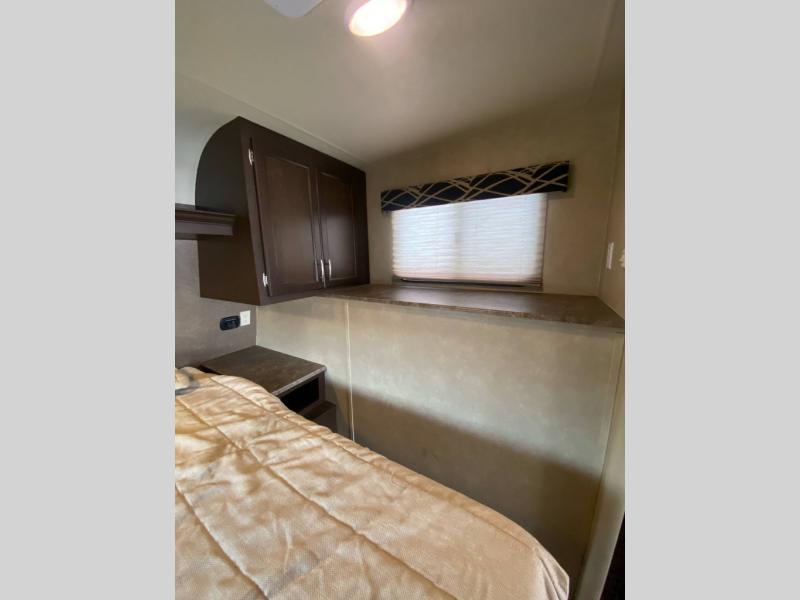 A front bedroom includes a corner queen bed with overhead cabinets, a nightstand and a wardrobe above.