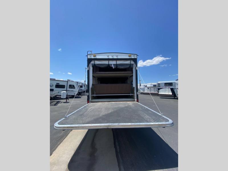 The cargo area includes a rear ramp door with a 97 1/2" opening wall to wall leading in to up to 15' of cargo space on one side and 12' on the opposite side of the trailer. A standard electric bed with flip sofa is at the rear of the cargo area.