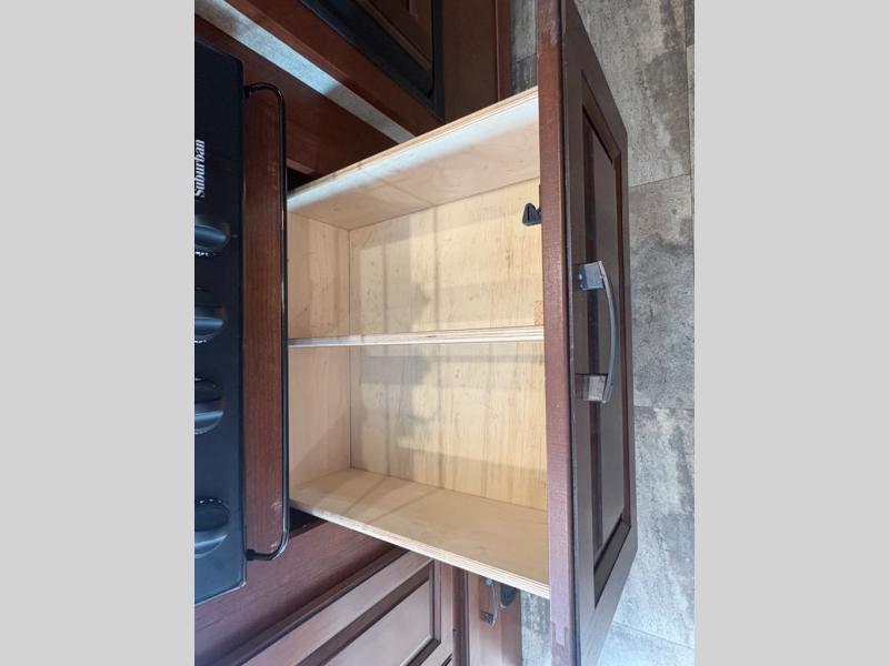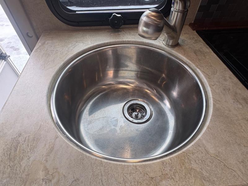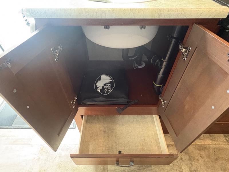 Opposite the dinette you will find the kitchen area which includes a refrigerator, a range top with microwave oven, and round single sink. There is also a flip-up counter for added prep space, or place to set dishes to be washed. There are also overhead cabinets for dishes and things, and a pantry for dry goods next to the dinette in the large slide across the coach.