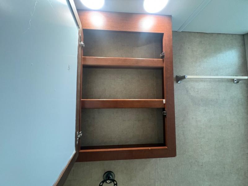 The rear of this unit features a complete bath along the curb side corner. Here you can find a convenient shower, toilet, and vanity with sink, plus overhead medicine cabinet. A curtain can be drawn just outside the bathroom door to the opposite side and section off the bedroom and bathroom space for more privacy at night.