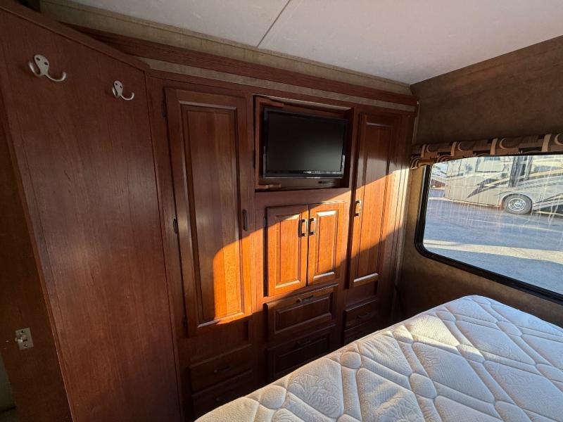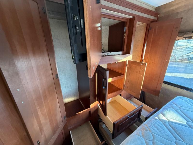A rear queen bedroom features overhead storage cabinets at the head of the bed. Double wardrobes and drawers are across the room with space for an optional TV.