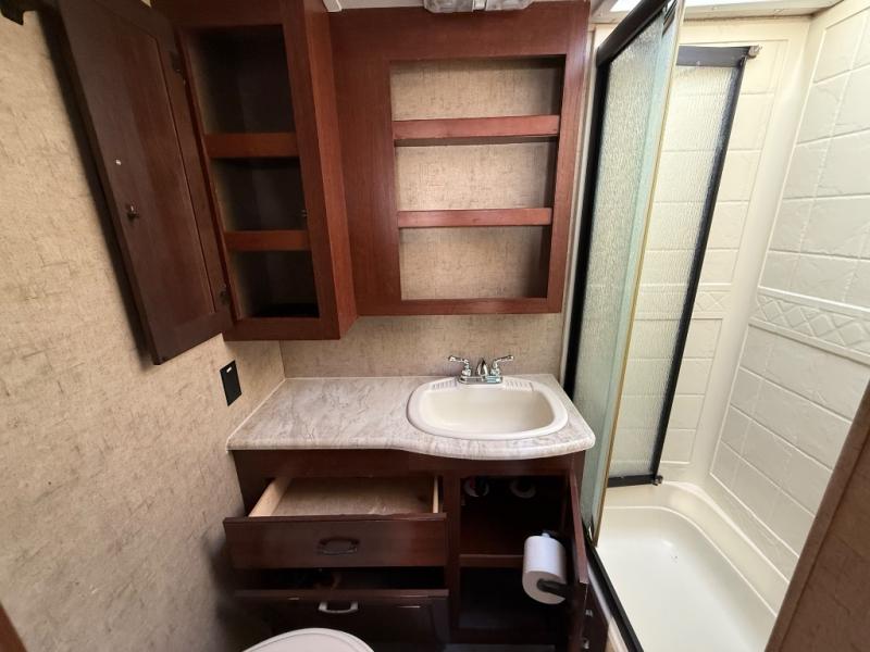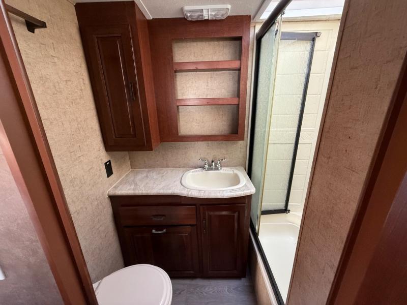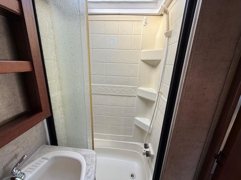 As you move toward the back of the Sunseeker 3170DS, a private kid's area offer a kid's sofa sleeper with a flip-down 28" x 72" bunk above. There is storage on the opposite wall.