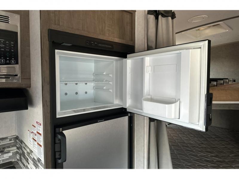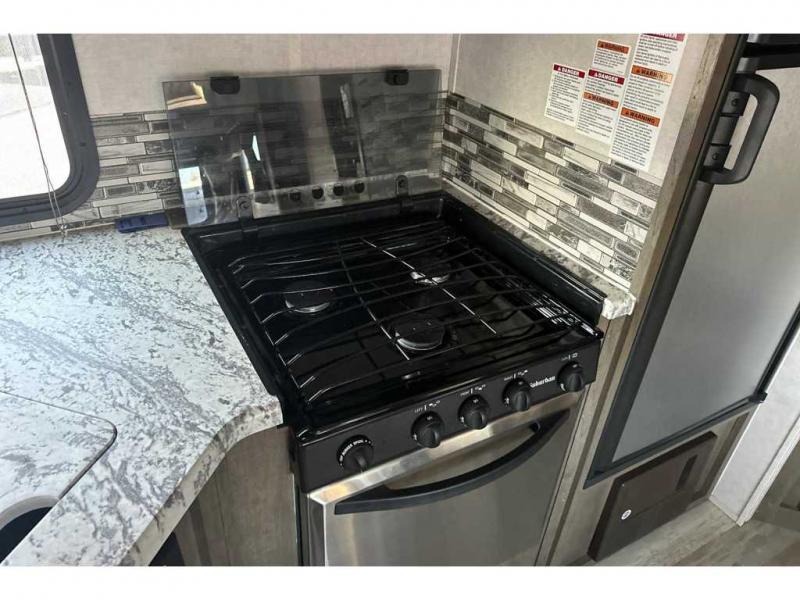 As you enter the travel trailer, straight in front of you there is an entertainment center. To the left of the entrance there is a double kitchen sink, three burner range, and refrigerator. Along the opposite side of the trailer you will find a u-dinette slide. The slide helps to open up the floor space and gives you a bit more room. Adjacent to the slide there is a large pantry.