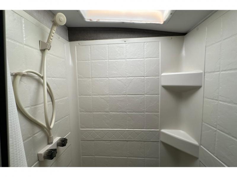 Located in the front of the trailer there is a queen bed with a super storage center below. Additional storage can be found with the wardrobes, and overhead cabinet.