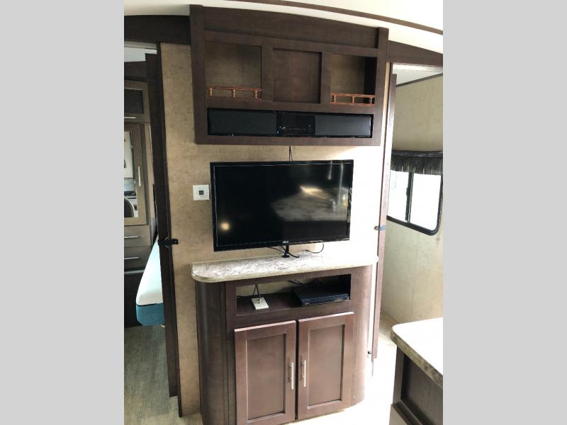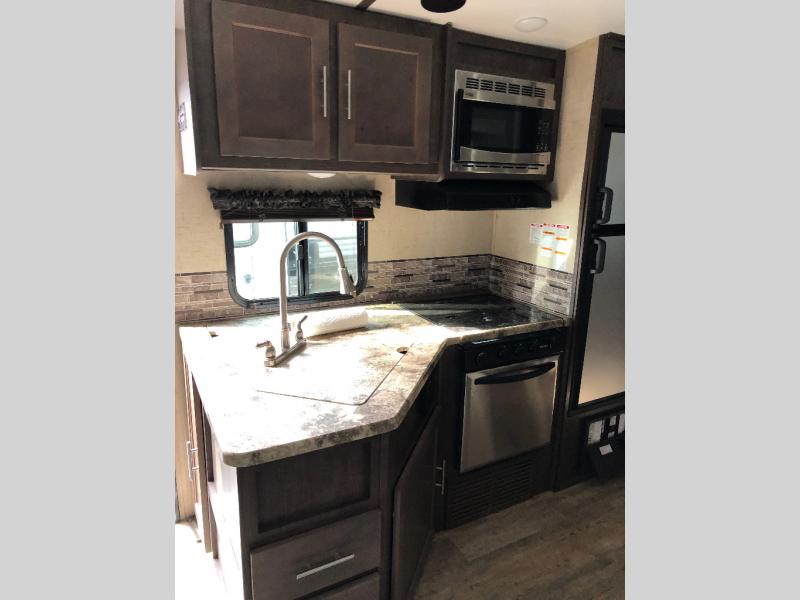 As you enter the travel trailer, straight in front of you there is an entertainment center. To the left of the entrance there is a double kitchen sink, three burner range, and refrigerator. Along the opposite side of the trailer you will find a u-dinette slide. The slide helps to open up the floor space and gives you a bit more room. Adjacent to the slide there is a large pantry.
