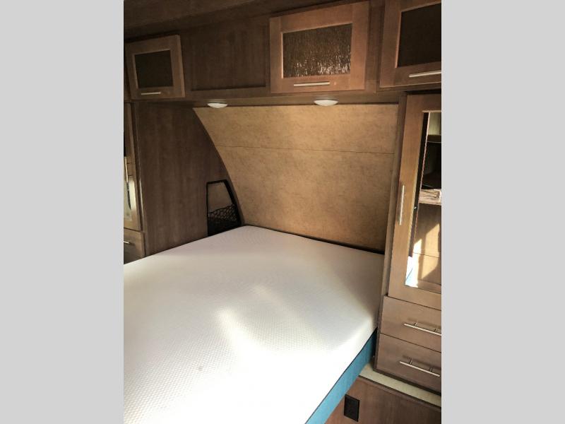 Located in the front of the trailer there is a queen bed with a super storage center below. Additional storage can be found with the wardrobes, and overhead cabinet.