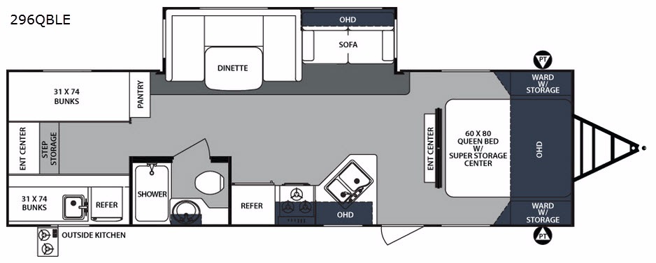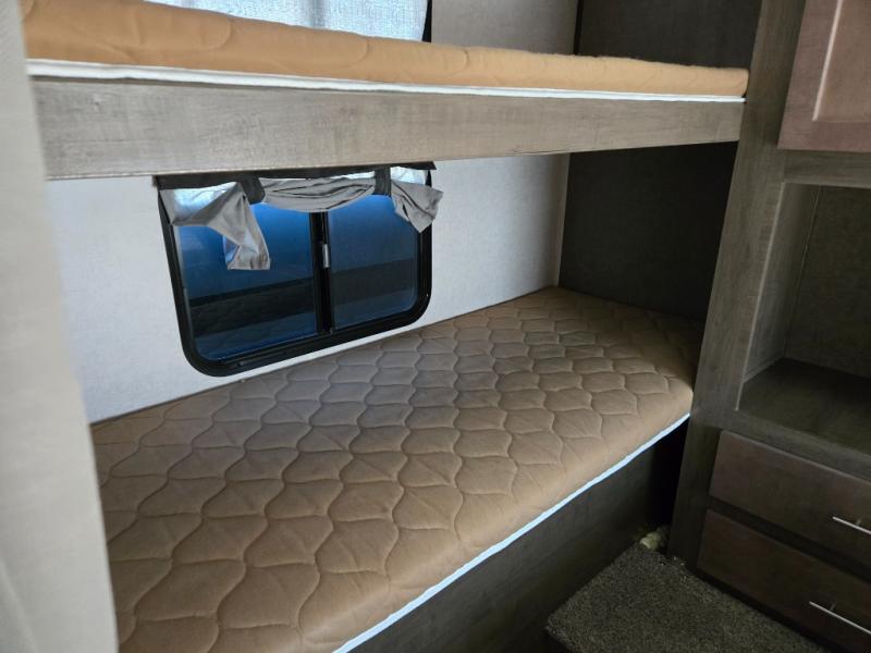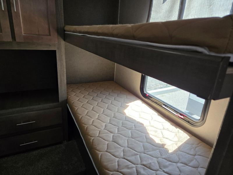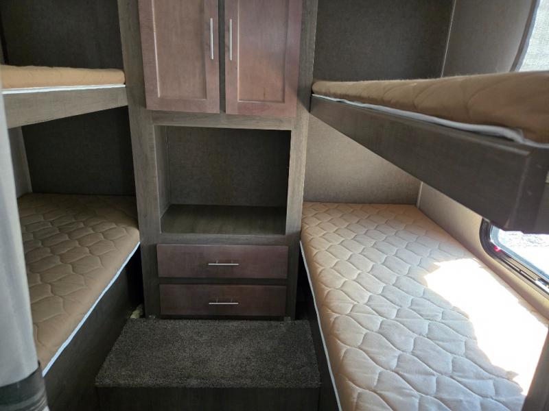 If you are looking for a travel trailer with a rear bunk house then the Surveyor 295QBLE by Forest River is the trailer for you. Your kids will love having their own space. The rear bunk house has two sets of bunks and an entertainment center.