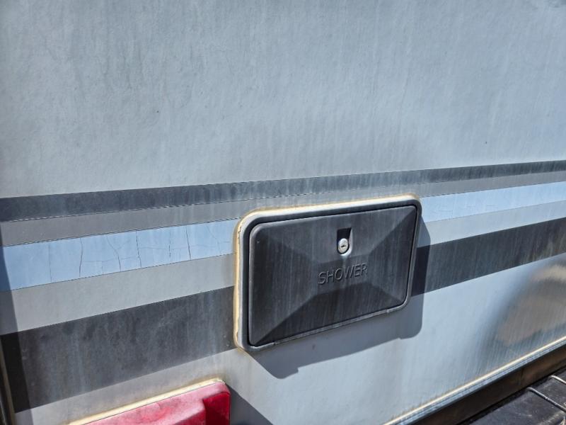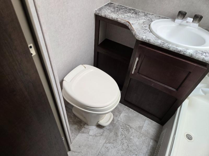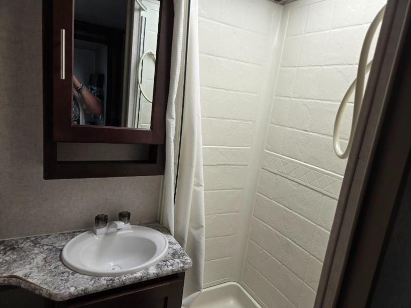 Proceeding toward the front of the trailer, the bathroom is on the right side. Inside the bathroom you will find a toilet, sink, medicine cabinet, and tub/shower.