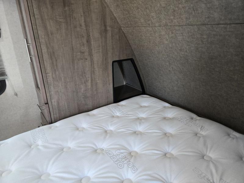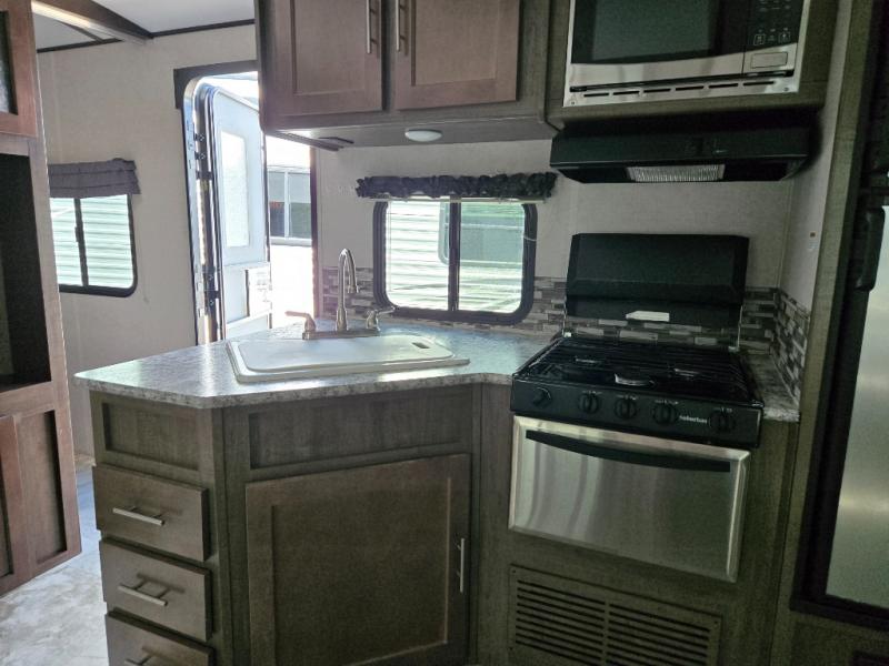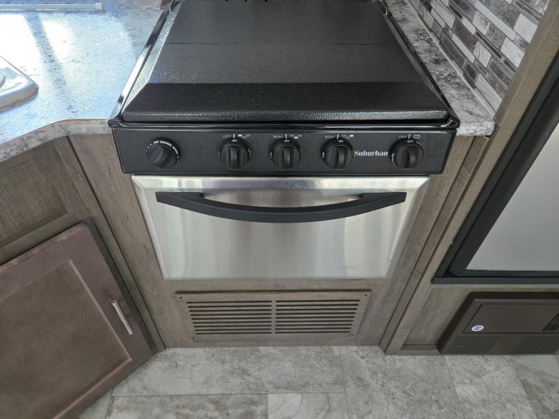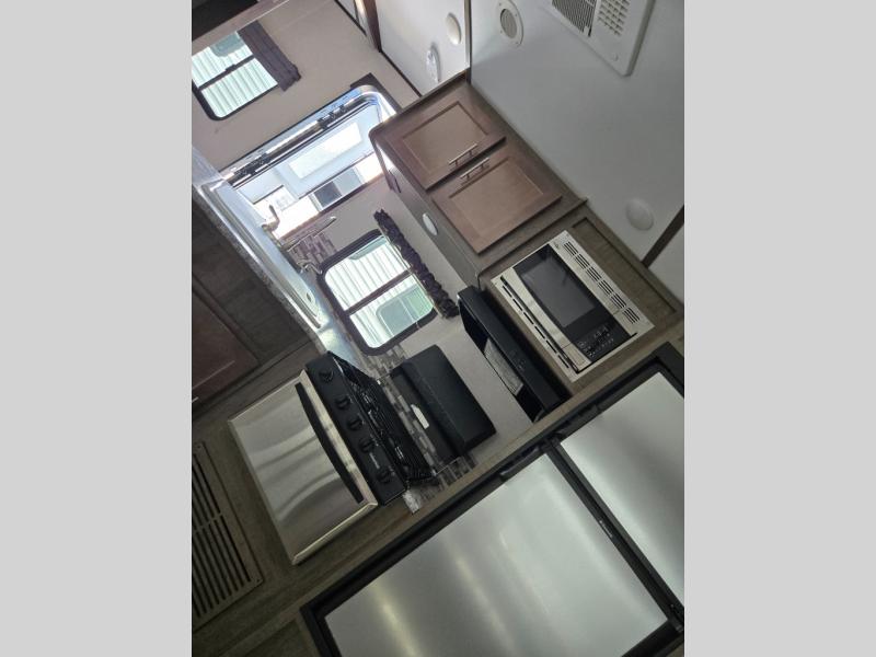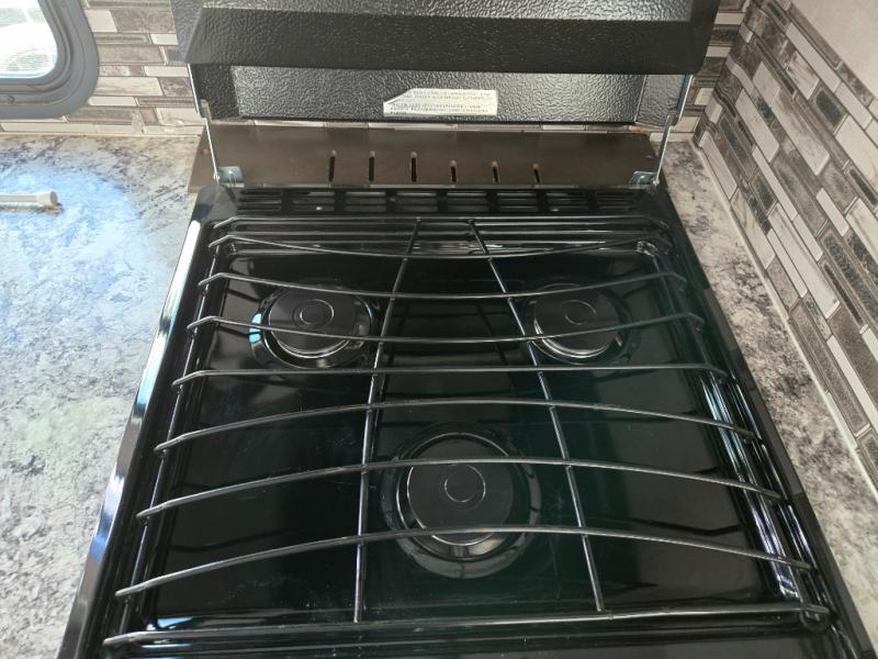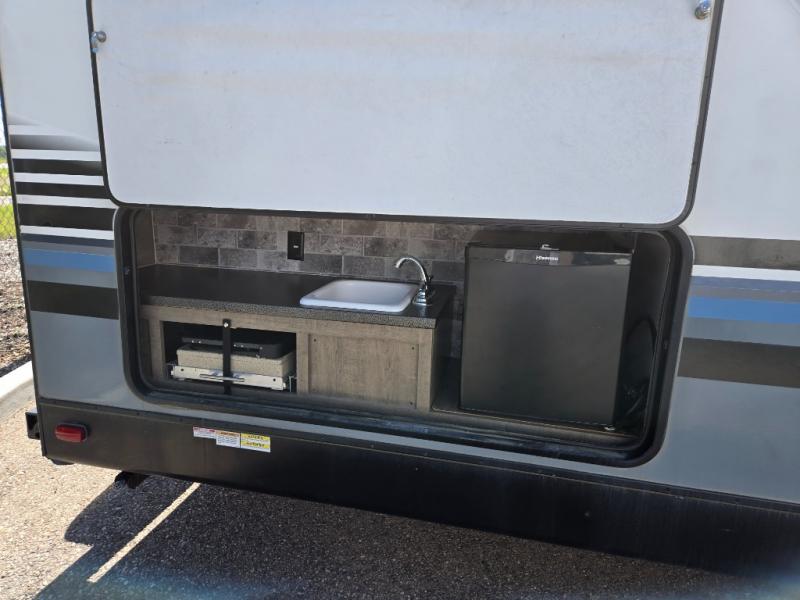 Outside enjoy the exterior kitchen with a two burner range, sink, and refrigerator. With the front pass thru storage area and overhead cabinets throughout the trailer, you can easily bring along all of the 'extras' to make your trip more enjoyable, plus so much more!