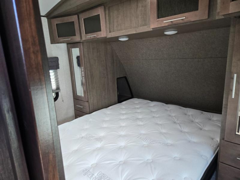 In the front bedroom you will find a queen bed with a super storage center below the bed and wardrobes with storage on either side.