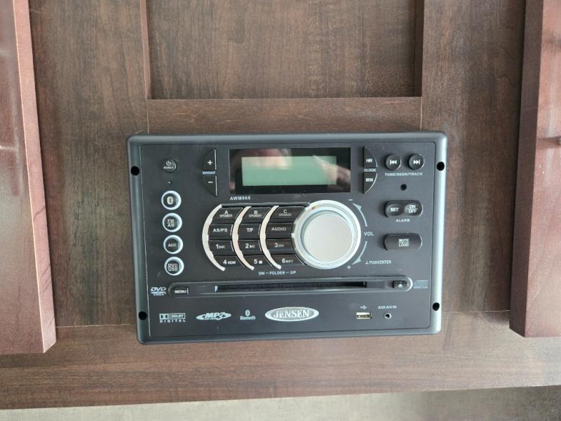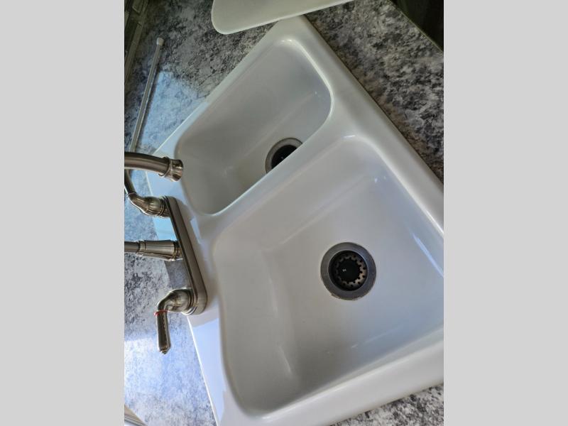 The kitchen area has a refrigerator, three burner range, and double kitchen sink along one side of the trailer. The opposite side has a slide which helps to open up the floor space. Along the slide out there is a sofa and u-dinette, and adjacent to the dinette there is a pantry for your dry goods. Along the front of the kitchen/living area you are sure to enjoy the entertainment center.