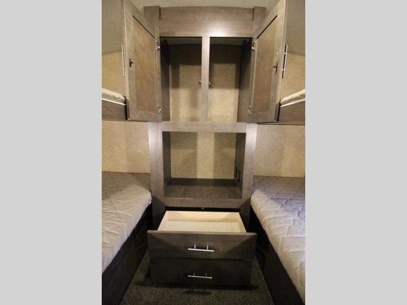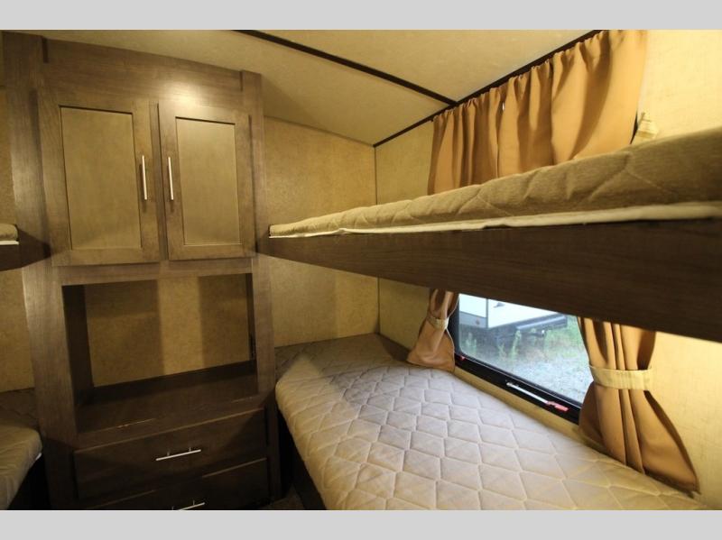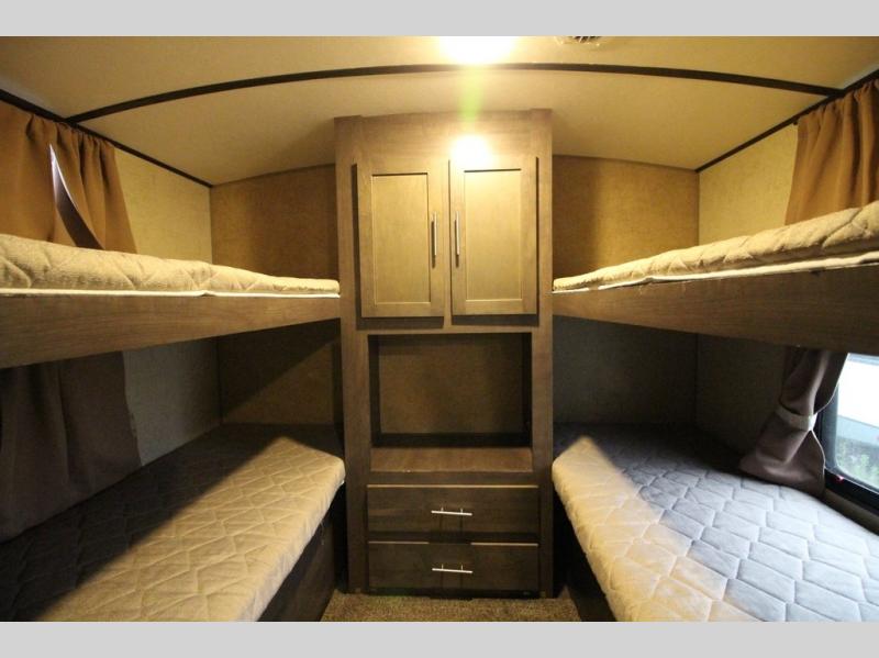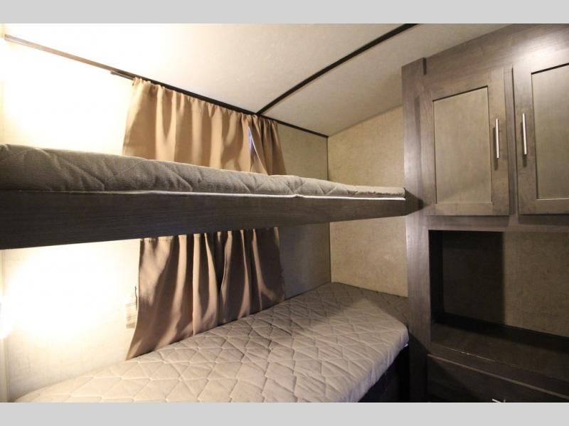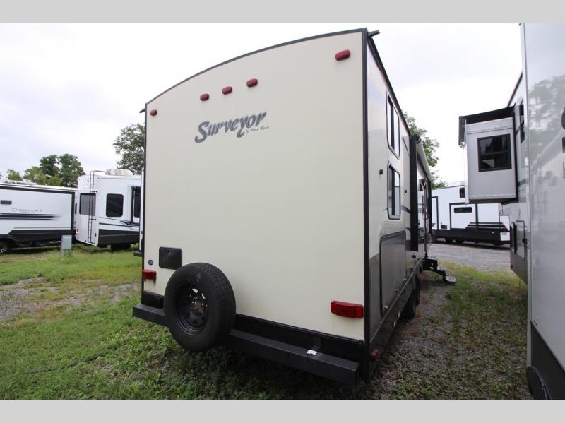 If you are looking for a travel trailer with a rear bunk house then the Surveyor 295QBLE by Forest River is the trailer for you. Your kids will love having their own space. The rear bunk house has two sets of bunks and an entertainment center.