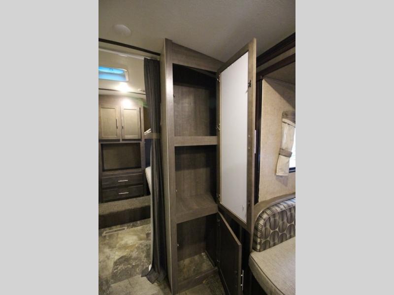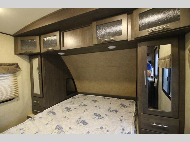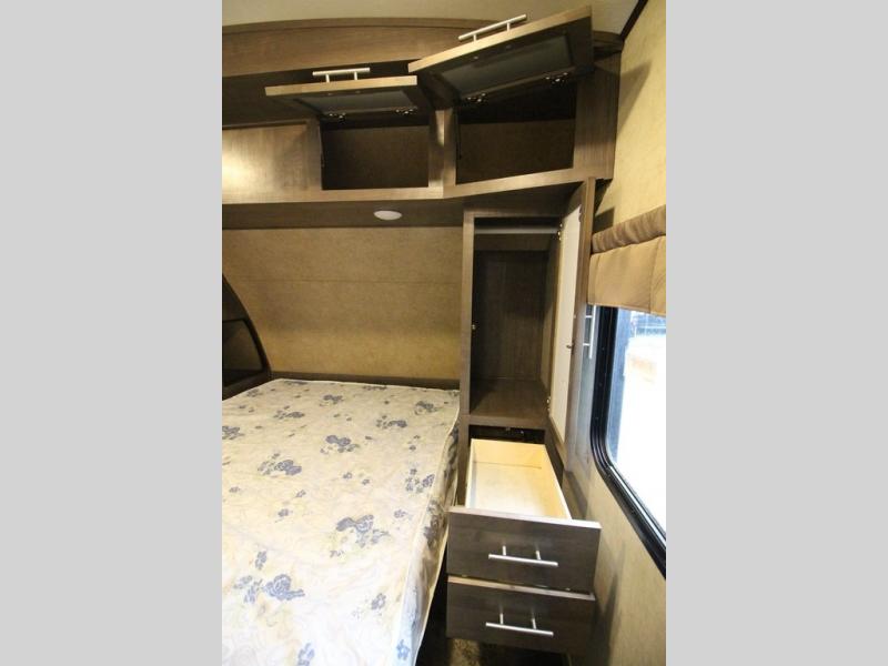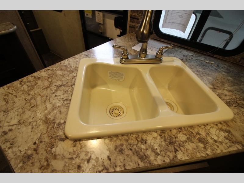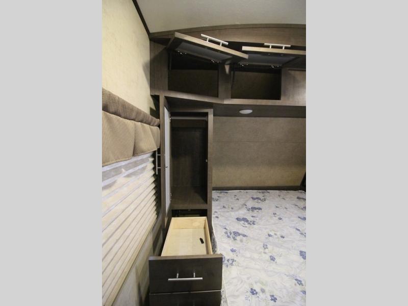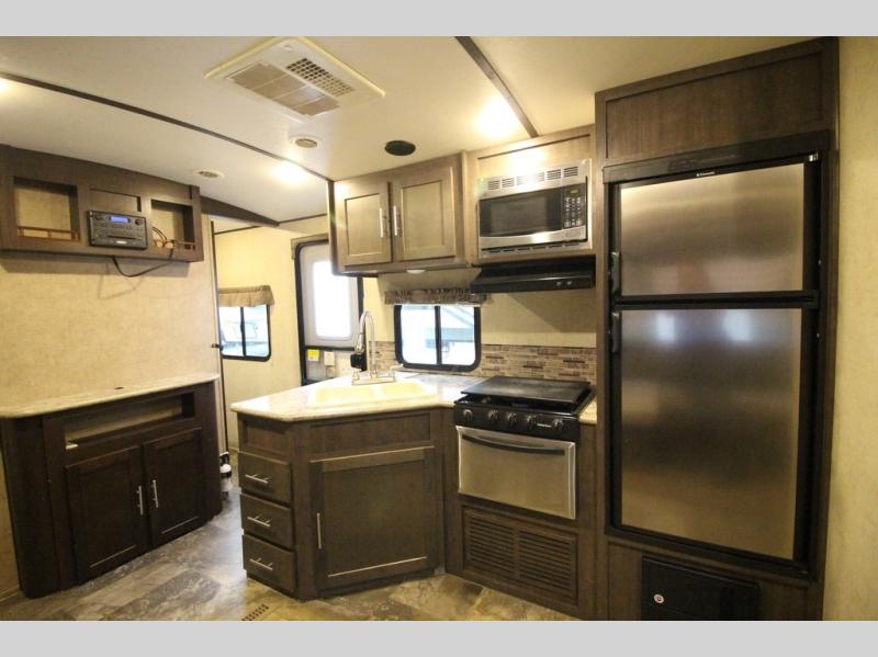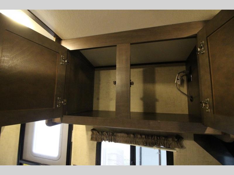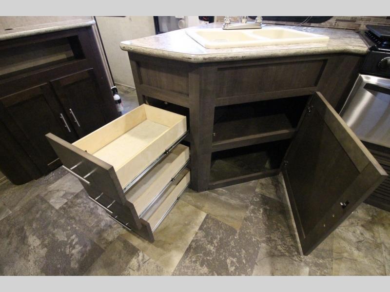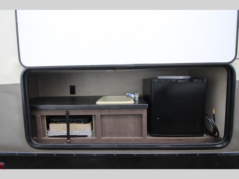 Outside enjoy the exterior kitchen with a two burner range, sink, and refrigerator. With the front pass thru storage area and overhead cabinets throughout the trailer, you can easily bring along all of the 'extras' to make your trip more enjoyable, plus so much more!