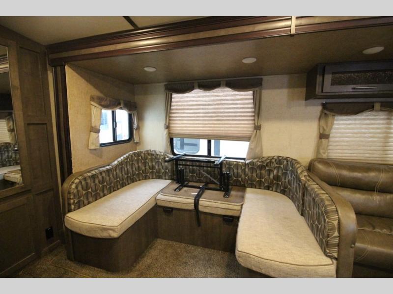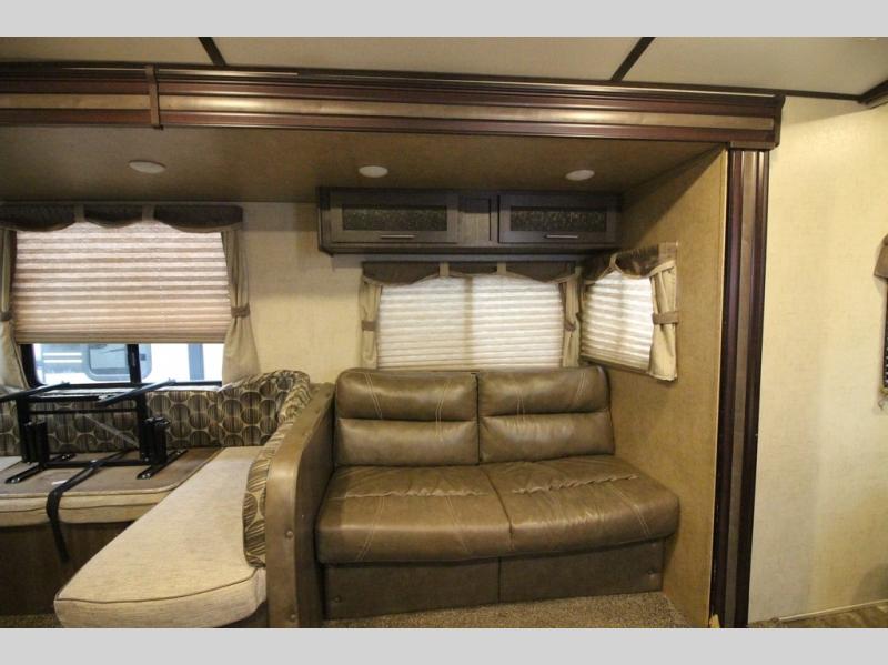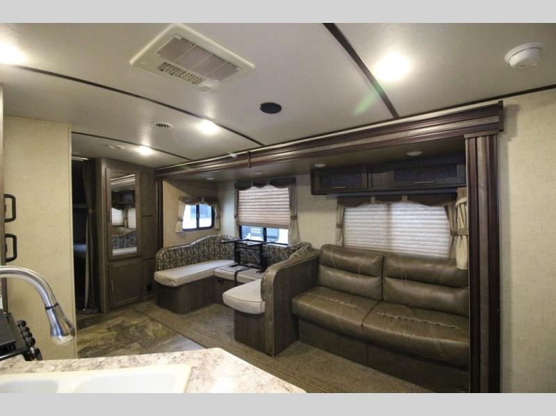 The kitchen area has a refrigerator, three burner range, and double kitchen sink along one side of the trailer. The opposite side has a slide which helps to open up the floor space. Along the slide out there is a sofa and u-dinette, and adjacent to the dinette there is a pantry for your dry goods. Along the front of the kitchen/living area you are sure to enjoy the entertainment center.