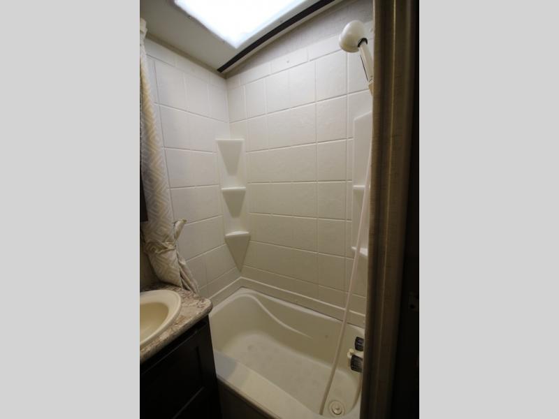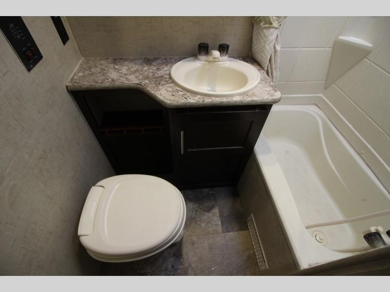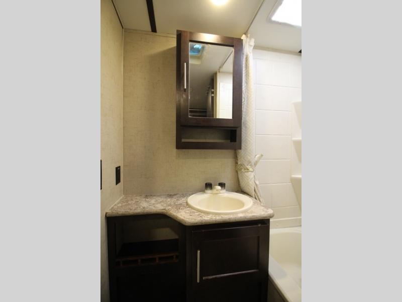 Proceeding toward the front of the trailer, the bathroom is on the right side. Inside the bathroom you will find a toilet, sink, medicine cabinet, and tub/shower.