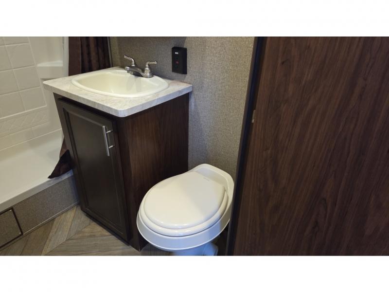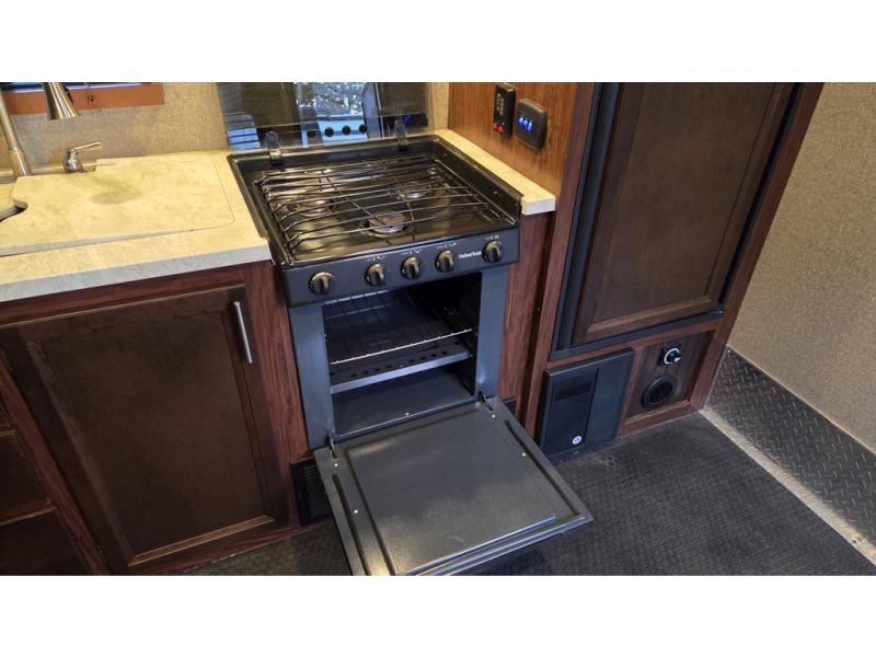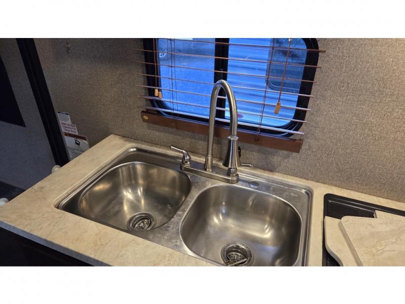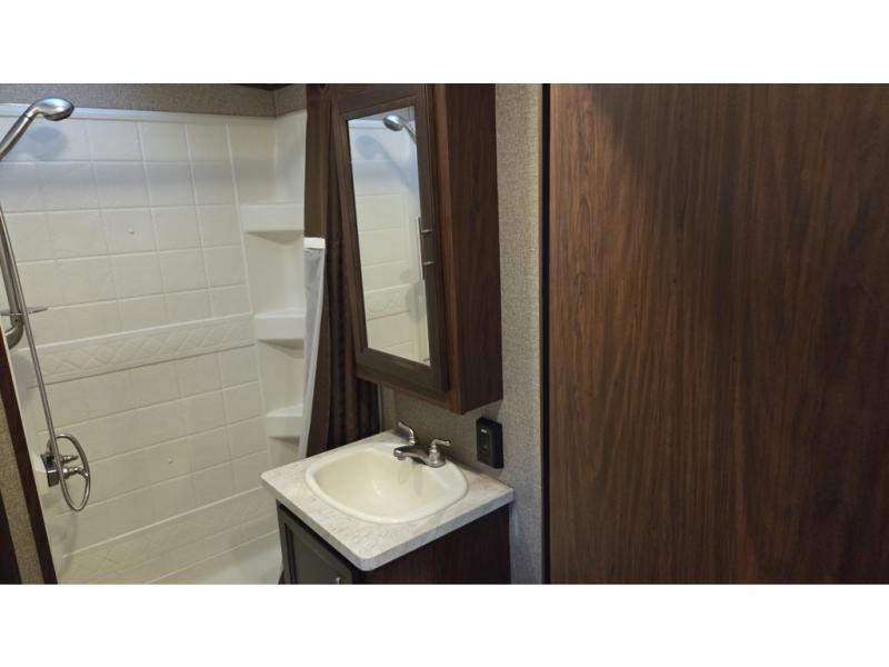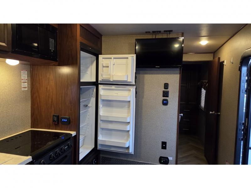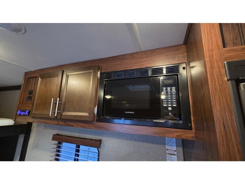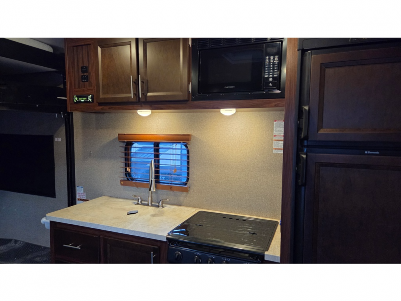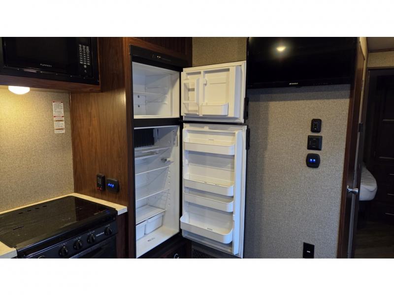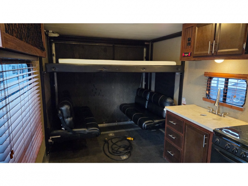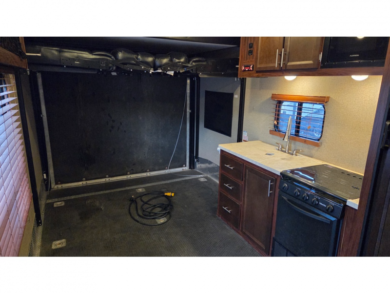 14' Garage! Tub Shower! Queen Bed!As you enter there are two sofas in the back with a fold up dinette in the center. Opposite there is a kitchen that will allow you to easily prepare meals and snacks while you are away. Enjoy the convenience of a refrigerator, a three burner range with overhead microwave oven, and a double sink. There is also an overhead cabinet for dishes and things.