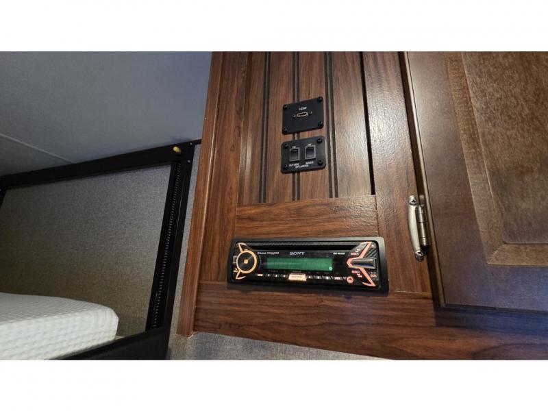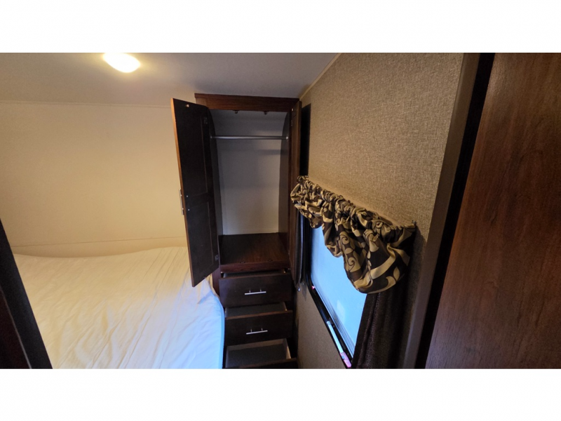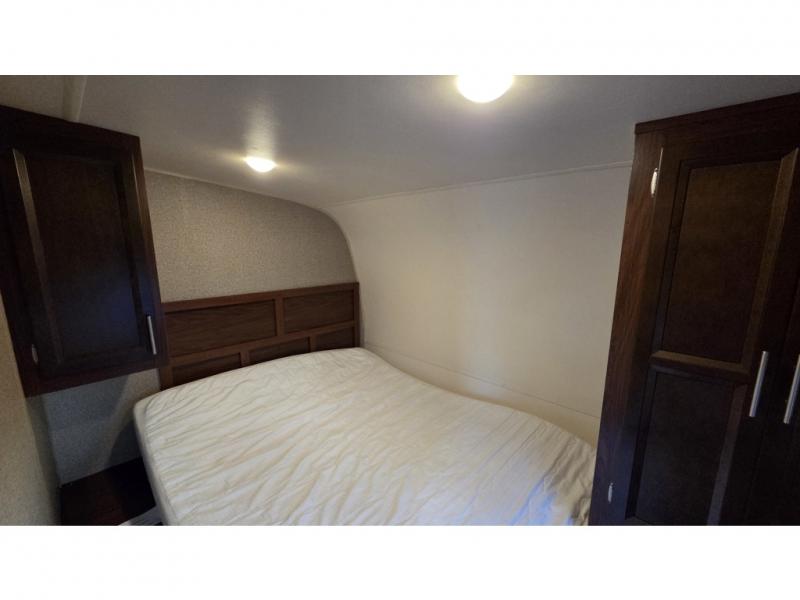 Continue on to the very front where you will enjoy a great night's rest on a queen size bed. There is also a corner wardrobe, plus a nightstand and shirt closet along the road side.