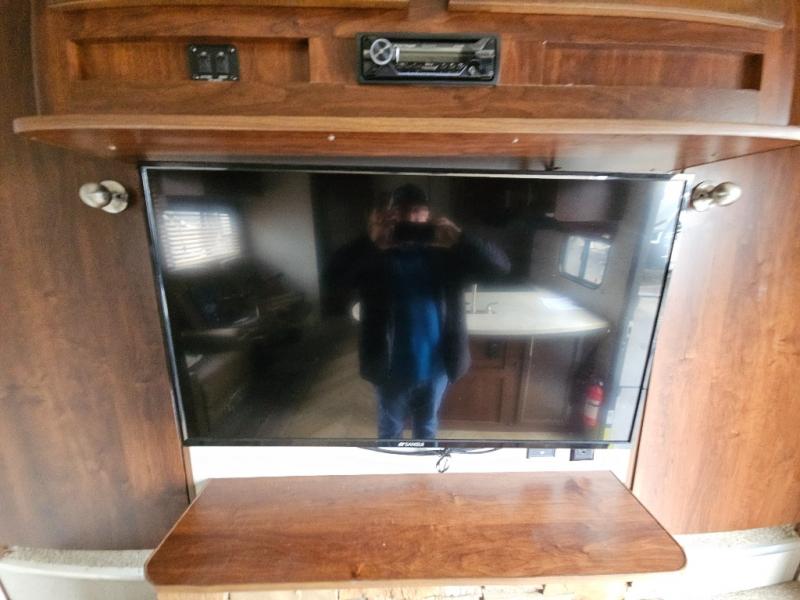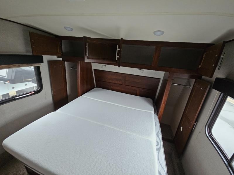 In the kitchen you will find a refrigerator, three burner range, and double kitchen sink as well as a bit more prep space on the L-shaped counter. The opposite side has a slide out sofa with recliners and overhead storage. You can relax on the sofa and enjoy the entertainment center with fireplace on the interior wall.