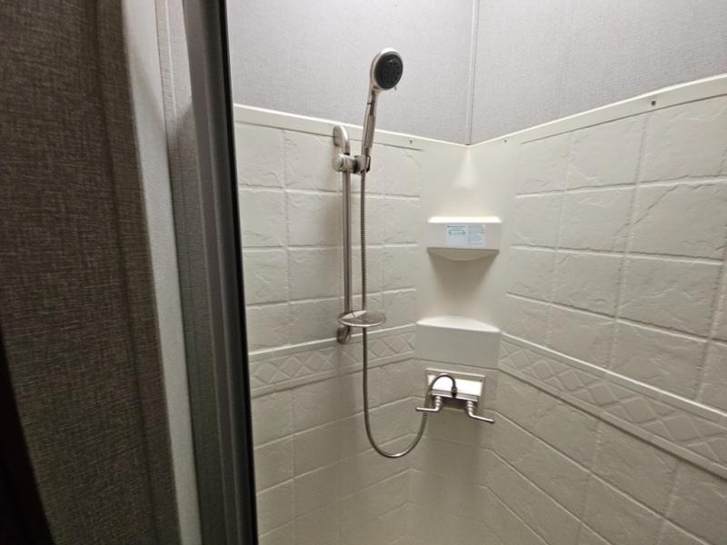 Continuing through the fifth wheel from the cargo area, you will come to the bathroom. Here you will find a sink, medicine cabinet, and a neo-angle shower along one side of the fifth wheel. Along the opposite side there is a toilet and a linen cabinet.
