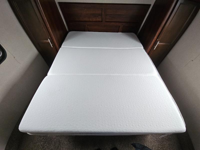 There is a set of steps on either side of the entertainment center which will lead you directly into the front bedroom. You can relax after a hard day of playing outside on the comfortable queen bed. Along either side of the bed there are wardrobes for all of your hang up clothes, and much more!