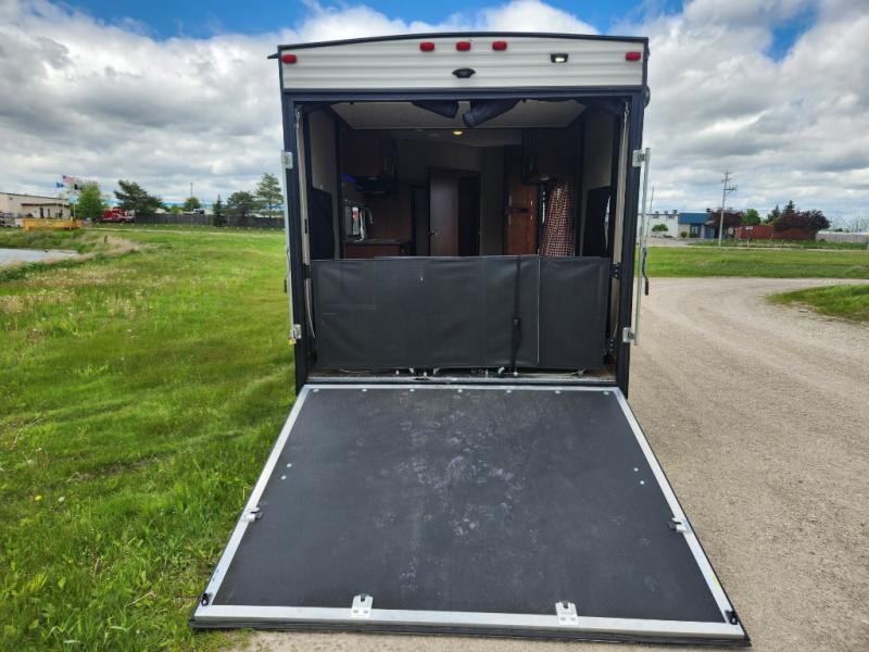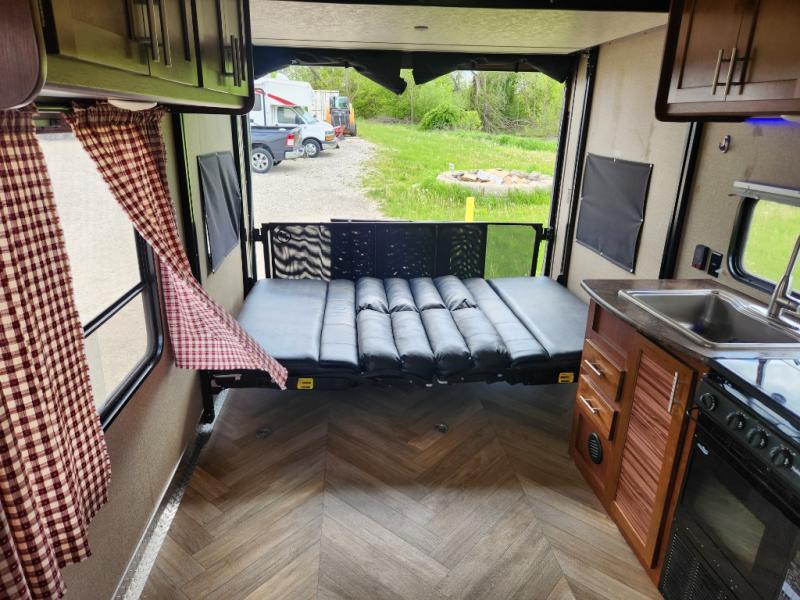 In the rear of the toy hauler, you will find two flip-up sofas with a free standing table. After your gear is unloaded this area makes for a nice area to enjoy your meals during the day, and at night you can easily convert the sofas into additional sleeping space.