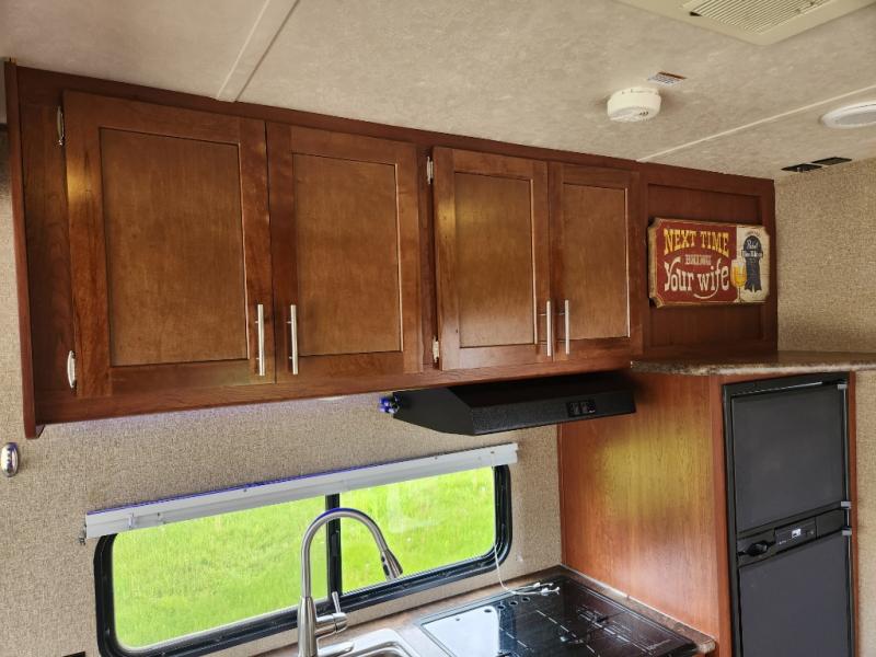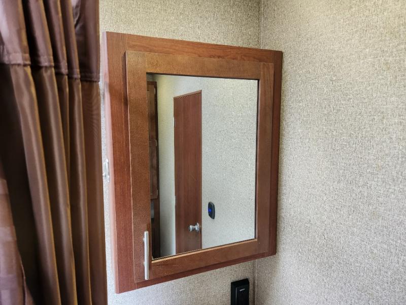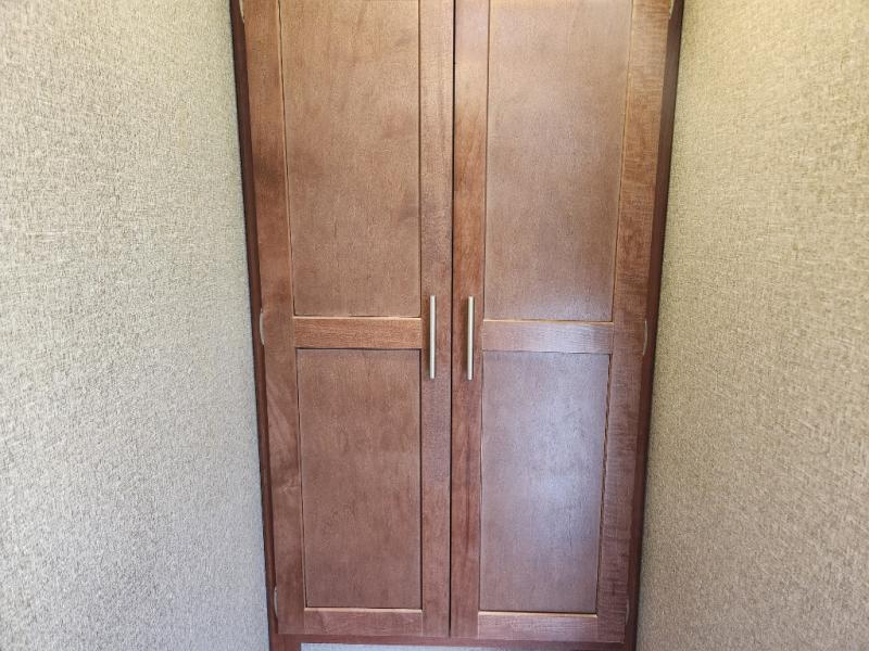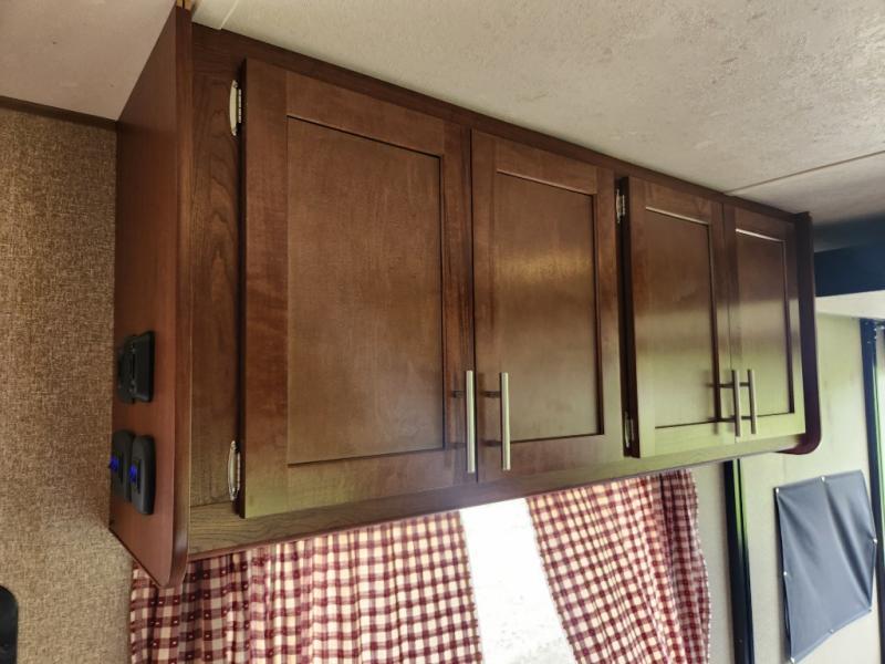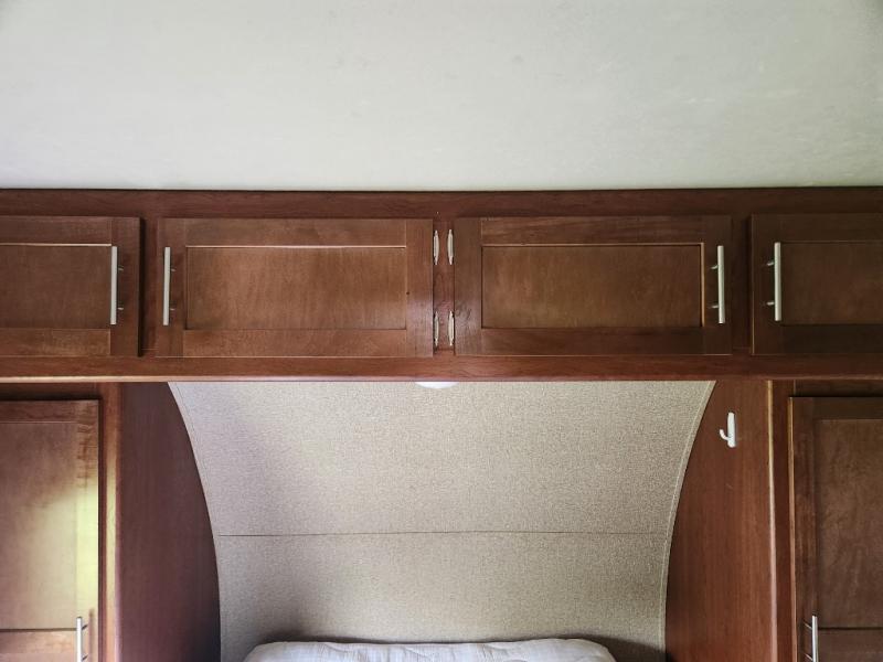 There are plenty of overhead cabinets throughout this toy hauler as well as outside storage and a mount for an outside TV, and more!