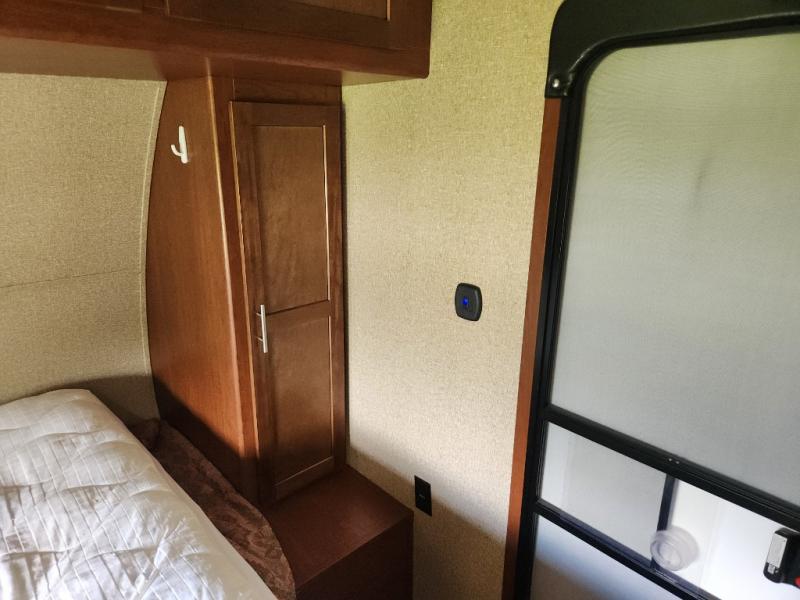 In the bedroom, you can enjoy a good night's rest on the king bed. Along one side of the bed there is a nightstand, and the other side has a wardrobe. You will also find a spot for a TV mount in the corner of the room. This bedroom also features a convenient private entry door which leads you outside.
